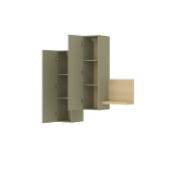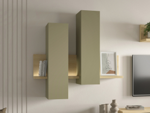 Asymetrická estetika: Netradičné usporiadanie závesných skriniek a políc rozbíja nudu klasických obývacích stien a ponúka priestor pre vašu kreativitu.