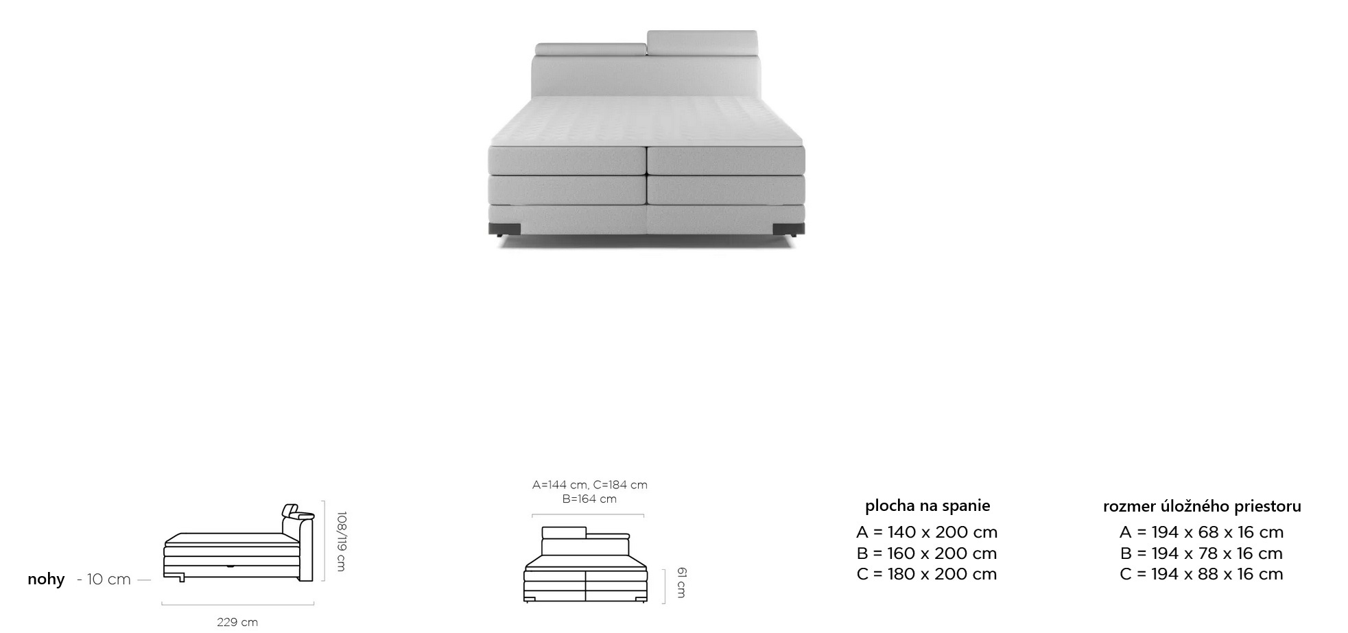 - rozmer lôžka 160x200cm, výška čela 108/119 x šírka 164 x dĺžka 229 cm