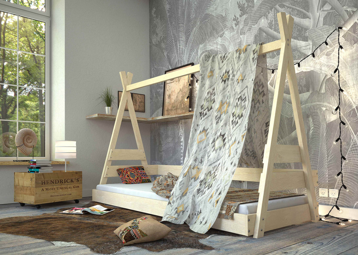 Detská posteľ TIPI, rozmery postele šírka 200 cm x výška 144,5 cm x hĺbka 80 cm, rozmer matraca je 200x80 cm odporúčaná výška matraca je 12 cm, v cene je zahrnutý rošt, v cene postele nie je zahrnutý matrac.