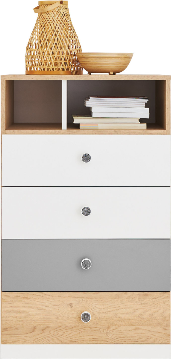 Súčasťou kolekcie sú rohové šatníky a skrine, ktoré poskytujú bohatý úložný priestor – či už v zásuvkách, policiach alebo na tyčiach na zavesenie oblečenia. Praktickosť dopĺňajú komody v rôznych šírkach a kombináciách úložného priestoru.