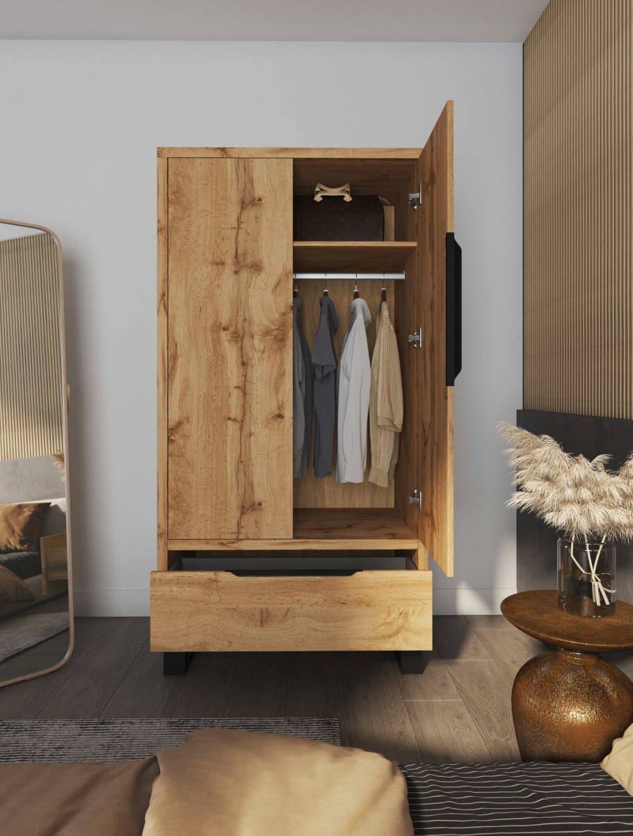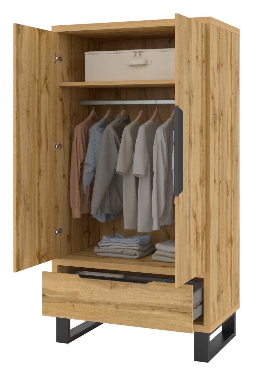 To, čo robí kolekciu HALLE výnimočnou, je jej mohutná konštrukcia. Korpusy s hrúbkou až 38 mm dodávajú nábytku vizuálnu váhu a stabilitu, ktorú v bežných reťazcoch nenájdete. Prírodný dekor dub wotan s výraznou kresbou dreva jemne zmäkčuje strohé línie čiernych kovových podnoží, čím vytvára vyvážený a útulný celok.