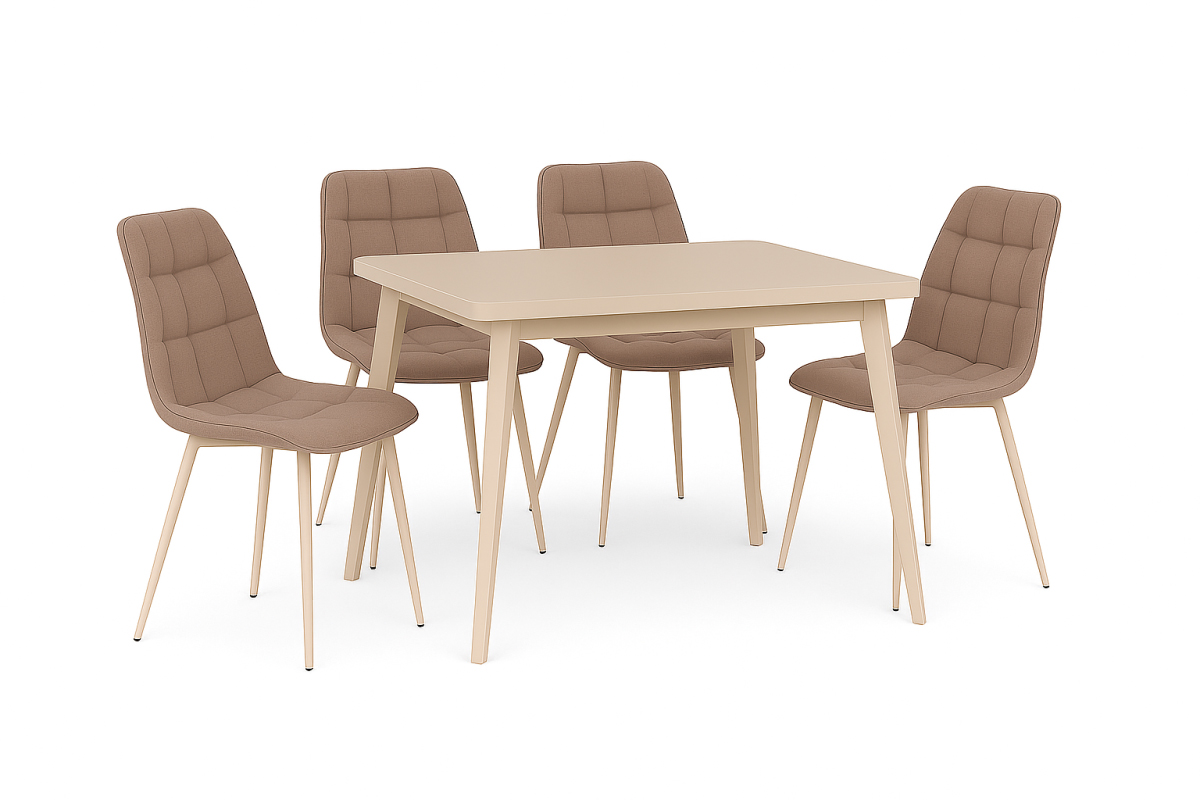 Moderný jedálenský set Oslo 6 so štyrmi stoličkami Chic v béžovej látke Brego 34 je skvelou voľbou pre štýlové a útulné jedálne či kuchyne. Kombinácia minimalistického stola a pohodlných čalúnených stoličiek vytvára harmonický celok, ktorý pôsobí moderne, ale zároveň nadčasovo.