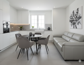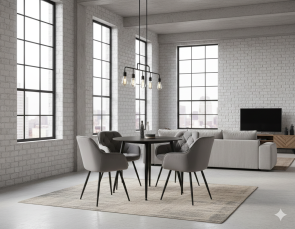 Moderný jedálenský set Rion Ø90 s keramickým plátom v čiernej matnej so štyrmi stoličkami CHERRY je ideálnym riešením pre menšie jedálne či kuchyne, kde oceníte kombináciu elegantného dizajnu a praktického prevedenia. Okrúhly stôl s mramorovým efektom a pohodlné čalúnené stoličky v sivej farbe vytvoria harmonický a štýlový interiér.
