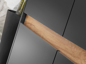 Moderný sektorový nábytok LONDON - komoda 4D, vo farebnom prevedení dub votan/antracit matný. Korpus, dvere - materiál certifikovaná laminovaná drevotrieska v hrúbke 16 mm. Hrany sú olepené ABS páskou, sklo vo vitrínach je kalené, bezúchytkový systém - dvere presahujú korpus, vo vedeniach zásuviek sú guličky, nožičky sú plastové.