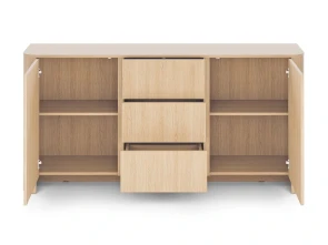 Zostava je navrhnutá bez nožičiek, vďaka čomu pôsobí kompaktne a stabilne, zároveň uľahčuje údržbu podlahy. Zásuvky s plnovýsuvom poskytujú maximálny komfort pri používaní a plynulý chod aj pri vyššom zaťažení.