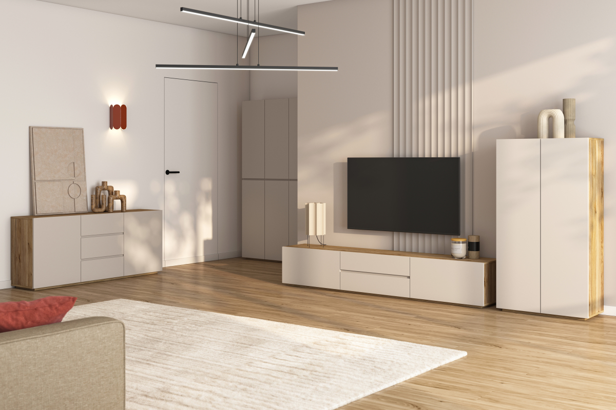 Elegantná a moderná komoda CRISS 25 zaujme svojím čistým dizajnom a trendovou kombináciou odtieňov dub Mauvella / kašmír. Jednoduché bezúchytkové otváranie s charakteristickým skoseným horným okrajom podčiarkuje minimalistický štýl a nadčasovú eleganciu.