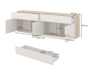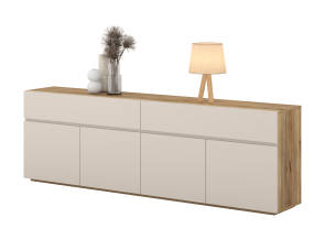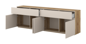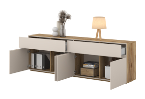 Vrchnú časť tvoria dve pohodlné zásuvky, spodnú časť tvoria štyri dvierka, ktoré vytvárajú dve samostatné skrinky po dvoch dvierkach, pričom vnútro je vertikálne predelené, bez vnútorných políc, čo umožňuje flexibilné uloženie väčších predmetov. Komoda stojí pevne na sokli, ktorý zdôrazňuje jej stabilitu a moderný dizajn.