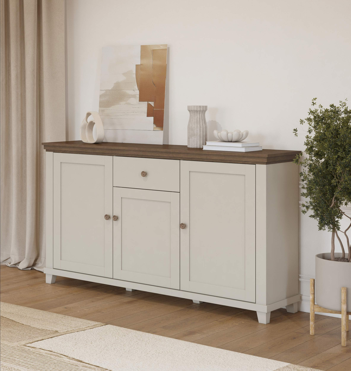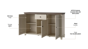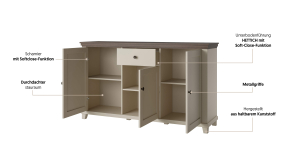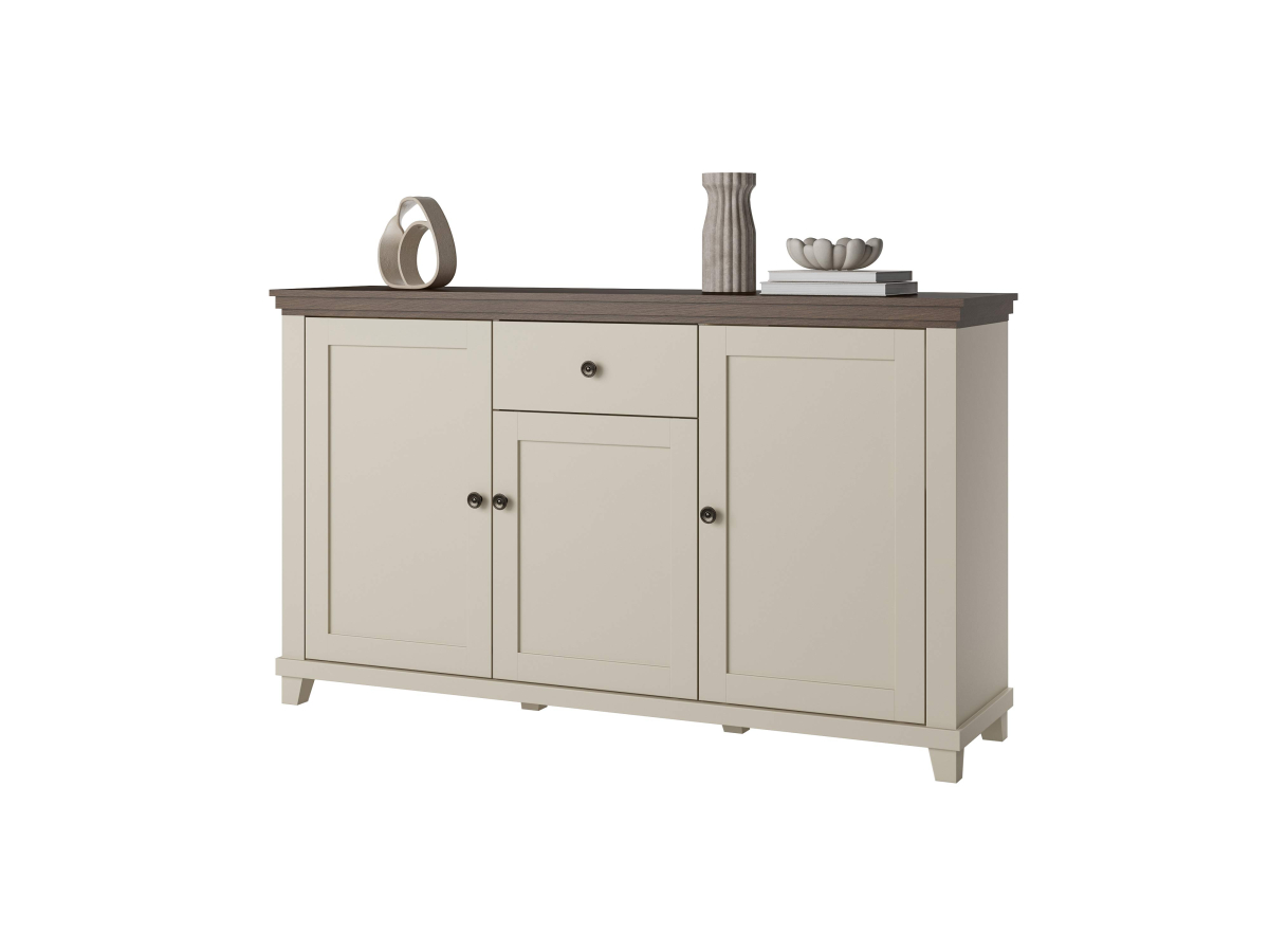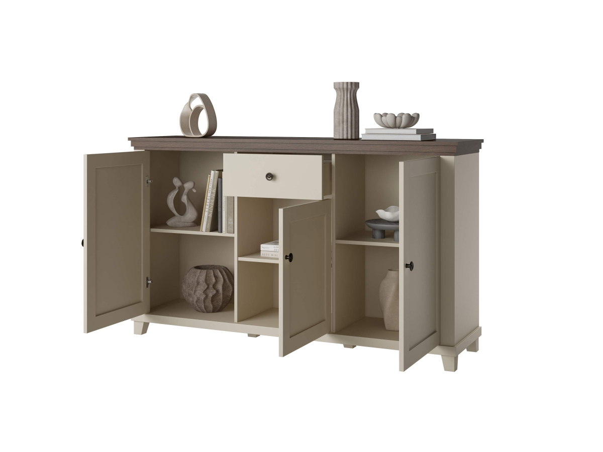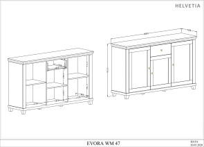 EVORA sektorový nábytok - komoda 24D1JU47 od firmy HELVETIA. Krásne farebné prevedenie bežová - bežová / dub dunin je výsledkom najnovších trendov bytových dizajnérov. Čo sa týka štýlu je možné nábytok EVORA zaradiť do modernejšej verzie klasického dizajnu, je vhodný do obývacej izby alebo jedálne. Korpusy sú vyrobené z laminovanej DTD, dvierka a vrchné vence sú potiahnuté fóliou. Nožičky sú vyrobené z plastu. Použité kvalitné pánty a kovové úchytky, zatvárenie dvierok a šuflíkov je vybavené systémom pomalého zatvárania. Nábytok EVORA má výbornú kvalitu prevedenia, zabalený je demont v kartónoch. Možnosť doobjednať LED osvetlenie.