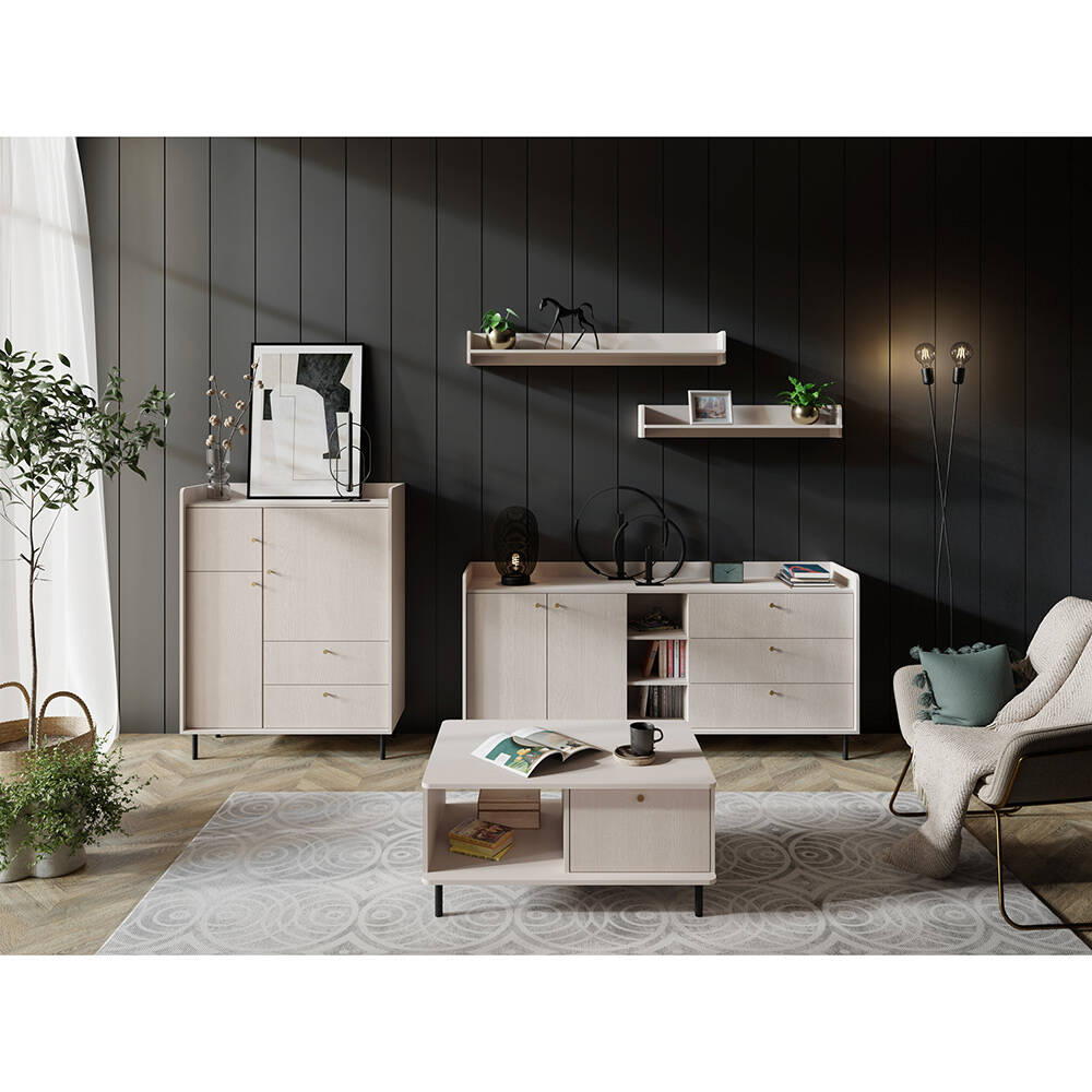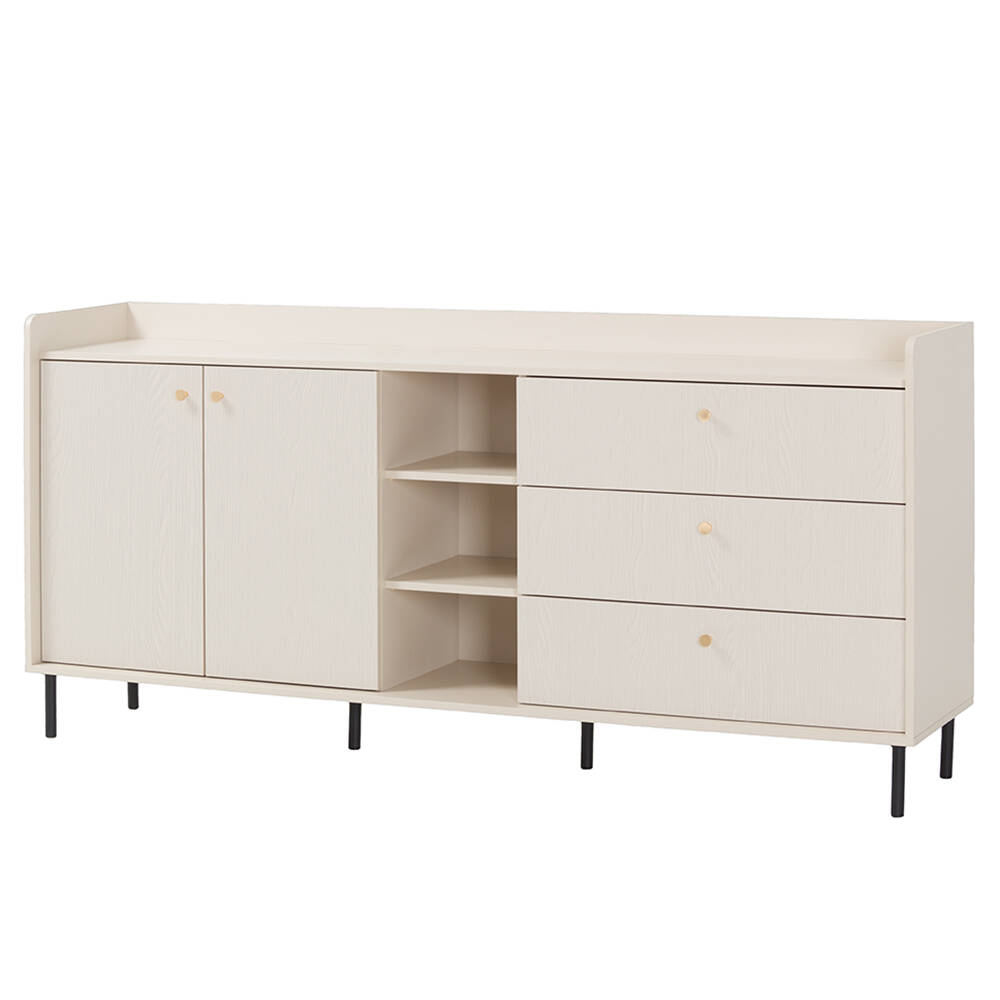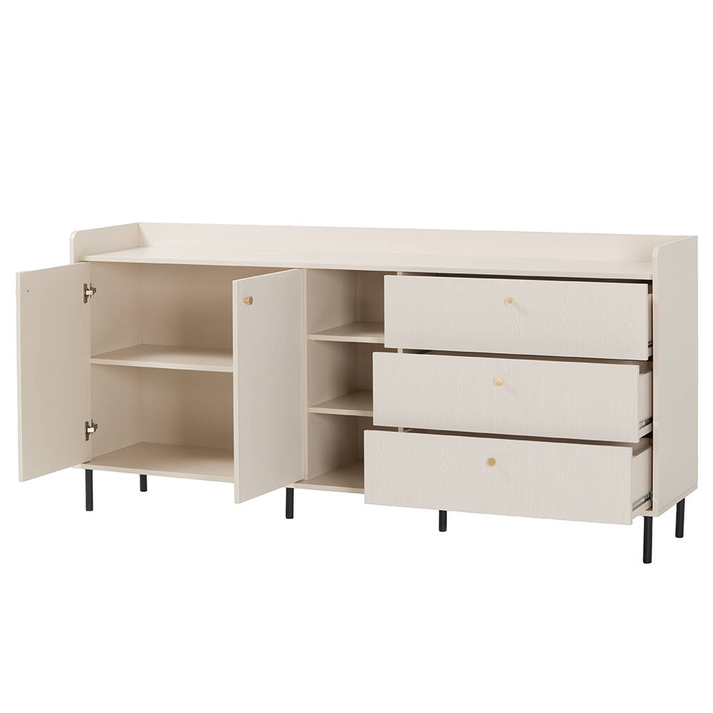 Komoda je vyrobená z kvalitnej laminovanej DTD, doplnená kovovými nohami a kovovými úchytkami, ktoré pridávajú nábytku ľahkosť, stabilitu a jemný luxusný akcent. Piesková farba korpusu, zlaté úchytky a čierne kovové nohy vytvárajú harmonický celok, vhodný do svetlého, vzdušného a útulného priestoru.