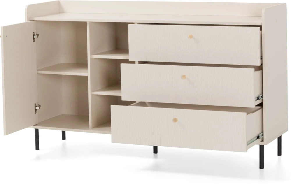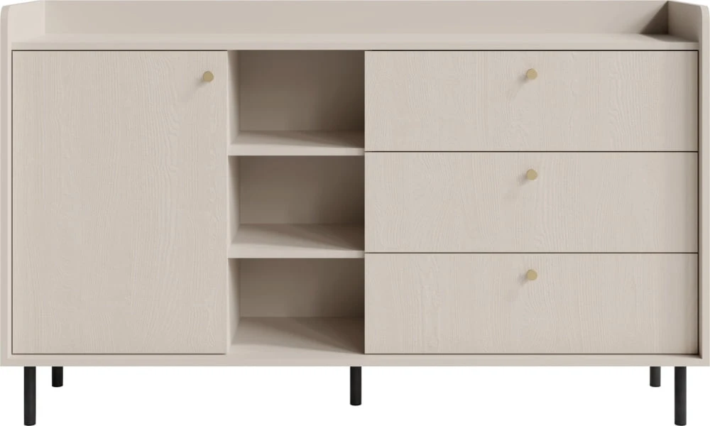 Vyrobená je z kvalitnej laminovanej drevotrieskovej dosky (DTD) a doplnená o kovové nohy a kovové úchytky, ktoré jej dodávajú ľahkosť, stabilitu a moderný vzhľad. Piesková farba korpusu v kombinácii so zlatými úchytkami a čiernymi kovovými nohami vytvára jemný, no výrazný kontrast, ktorý pôsobí elegantne a harmonicky. Komoda tak prirodzene zapadne do svetlého, vzdušného a útulného interiéru.