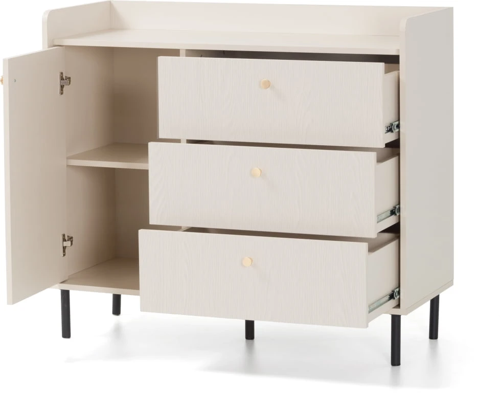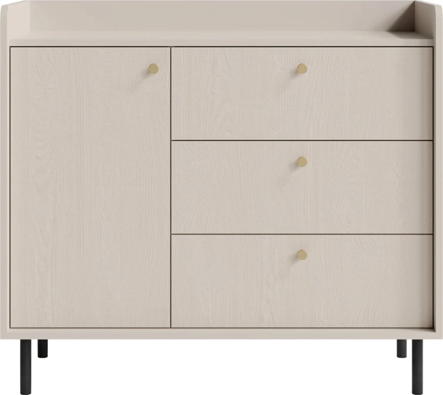 Vyrobená je z kvalitnej laminovanej DTD, doplnená o kovové nohy a kovové úchytky, ktoré nábytku dodávajú stabilitu, ľahkosť a moderný vzhľad. Piesková farba korpusu v kombinácii so zlatými úchytkami a čiernymi kovovými nohami vytvára harmonický, elegantný kontrast, ktorý krásne vynikne v každom svetlom a vzdušnom interiéri.