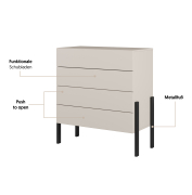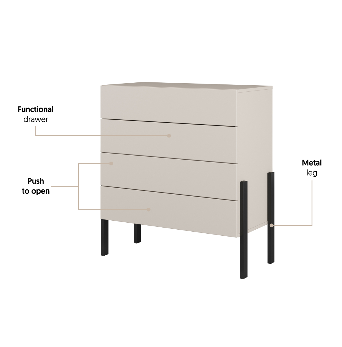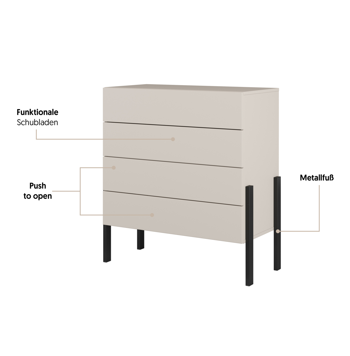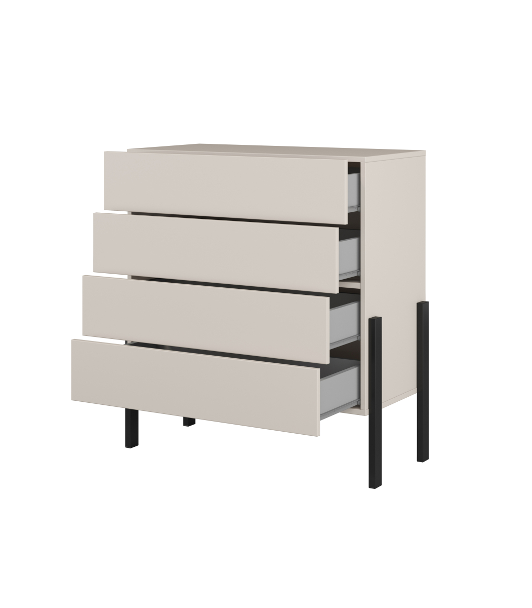 Sektorová spálňa JUKON - komoda 24KSND22 - moderný spálňový nábytkový sektor v nadčasovom dizajne, trendovom farebnom prevedení kašmír, na vysokých / 19,5 cm / čiernych kovových nožičkách. Spálňa JUKON prinesie do interiéru vašej spálne eleganciu, atmosféru harmónie a tepla. Trendový kašmírový odtieň v kombinácii so štíhlymi čiernymi nohami vytvára jemný kontrast, ktorý prinesie do interiéru vašej spálne vizuálnu ľahkosť a vzdušnosť. Materál z ktorého je nábytok vyrobený je laminovaná certifikovaná drevotrieska v hrúbkach 15, 22 mm. Úchytky nie sú, na otváranie slúži systém STLAČ A OTVOR.