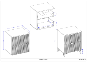 Kúpeľňový nábytok LAURA čierna - zostava č.2 s nožičkami, moderný nábytok do kúpeľne vyrobený vo výbornej kvalite prevedenia, farebné prevedenie čierna matná/čierna matná pyramídky. Materiál použitý na výrobu korpus - certifikovaná laminovaná drevotrieska v hrúbke 15 mm, hrany ohranené ABS páskou, dvierka - fólia na MDF v hrúbke 18 mm - profil dvierok v tvare malých pyramíd. Úchytka je kovová v zlatej farbe, zatváranie dvierok a šuflíkov pomocou systému pomalého zatvárania.