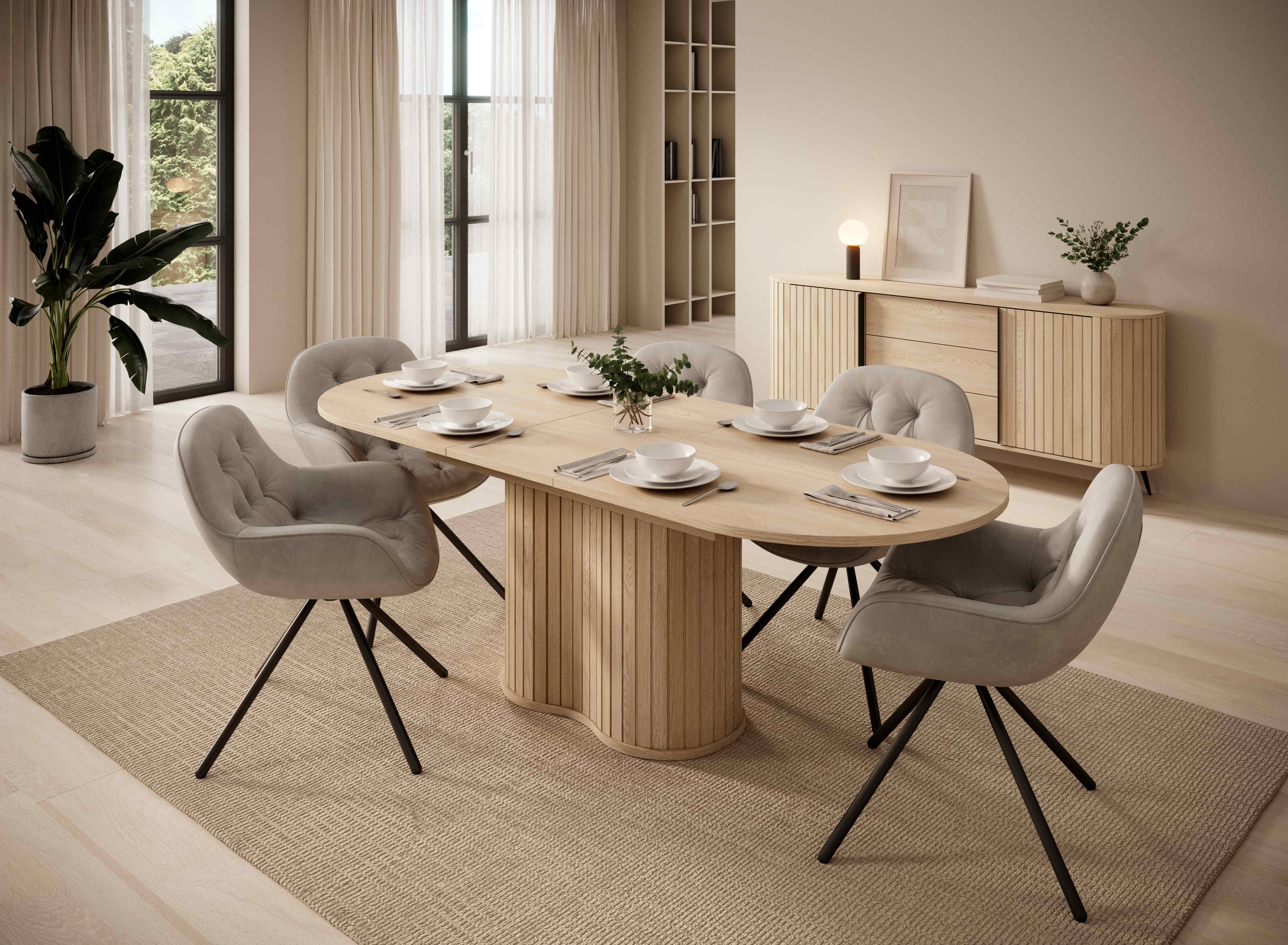 jedinečný obyvačkový sektor v trendovom dizajne na vysokých čiernych nožičkách a výbornej kvalite prevedenia. Zaoblené boky na korpusoch vyplnené zvislými lamelami, zasúvacie dvierka zo zvislými drážkami a kovovými čiernymi úchytkami, šuflíky so systémom