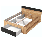 Posteľ ponúka praktický úložný priestor v prednej časti, ktorý tvorí výsuvný šuflík – ideálne riešenie na uloženie posteľnej bielizne, prikrývok či sezónnych vecí. Plastové úchytky zabezpečujú pohodlnú manipuláciu a dlhú životnosť.