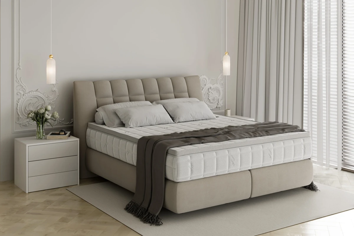 - Elegantný dizajn: Posteľ zaujme svojím moderným tvarom a hlbokým prešívaním, ktoré dodáva štýlový vzhľad a jedinečný charakter