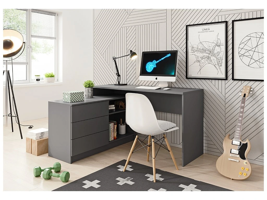 Objavte stôl, ktorý spája funkciu s dizajnom: písací stôl TEO je moderný rohovo‑orientovaný pracovný priestor, ideálny pre študentskú izbu, domácu kanceláriu alebo detskú pracovňu.
