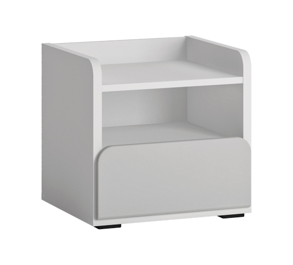 Kvalitný detský alebo študentský nábytok ALBI - nočný stolík. Variabilný nábytkový sektor vo výbornom dizajne a kvalite prevedenia. Farebné prevedenie alpská biela - šedý lesk. Materiál korpusu je certifikovaná laminovaná drevotrieska v hrúbke 16 mm, dvere sú vyrobené z MDF na ktorej je vysokokvalitná fólia v lesku. Hrany sú na predĺženie životnosti ohranené ABS páskou, namiesto úchytiek sú na dvierkách výfrezy, nožičky sú plastové, vedenia v šuflíkoch sú s plným výsuvom.