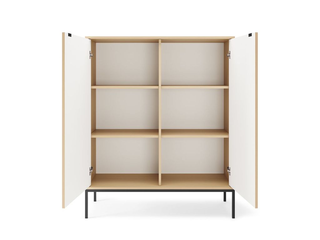Interiér komody je prakticky riešený: vnútorná časť je rozdelená zvislou priečkou na polovicu, pričom na každej strane sa nachádzajú dve poličky, ktoré umožňujú efektívne usporiadanie vecí.