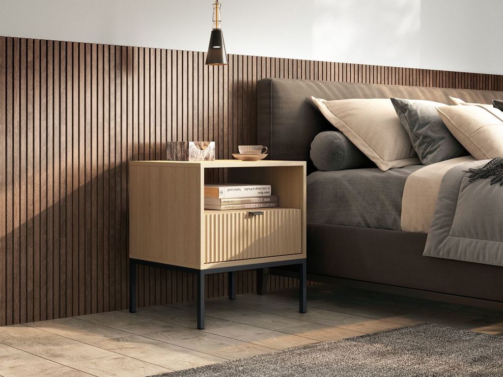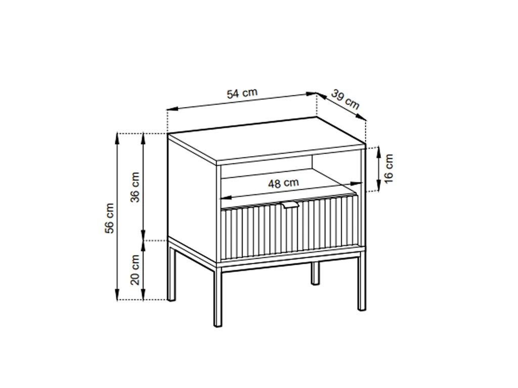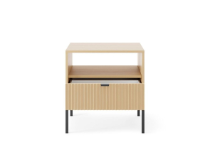 Stolík je vybavený praktickou zásuvkou na uloženie drobných predmetov a otvorenou nikou, ideálnou na knihy alebo dekorácie. Nábytok stojí na čiernych kovových nožičkách, ktoré pridávajú moderný kontrast a opticky odľahčujú stolík. Čierny kovový úchyt ladí s nožičkami a dopĺňa čistý, moderný vzhľad.