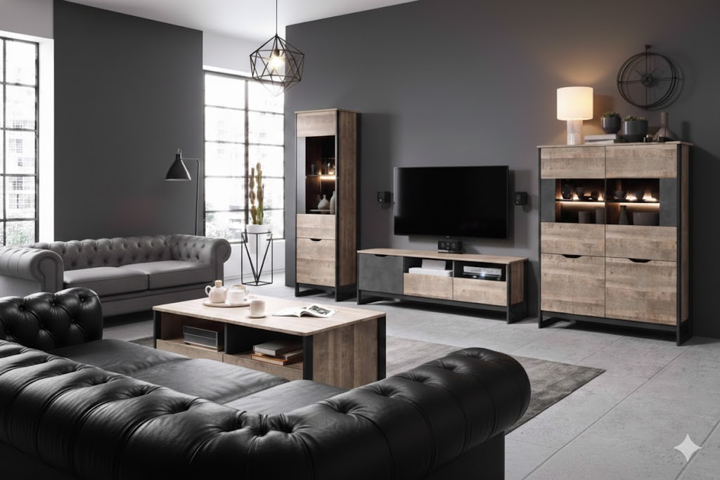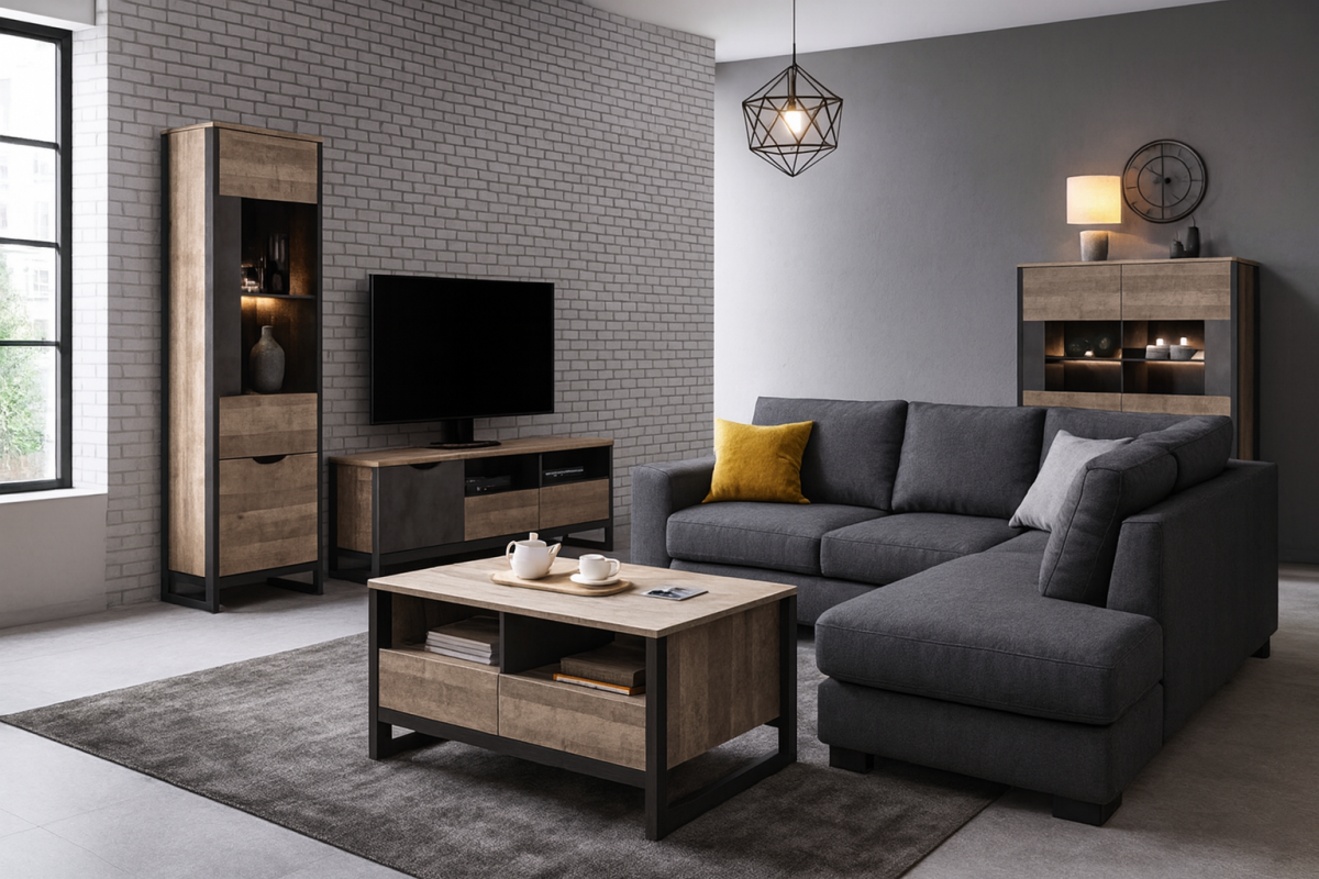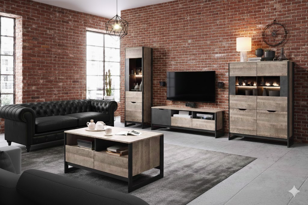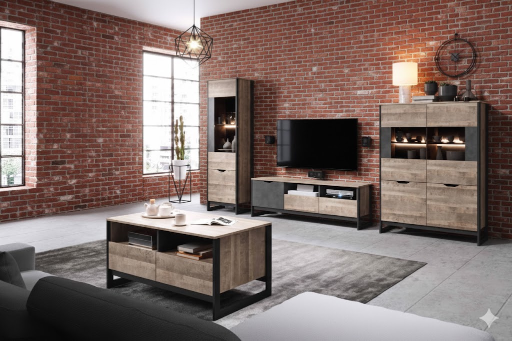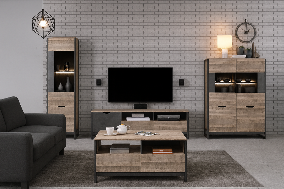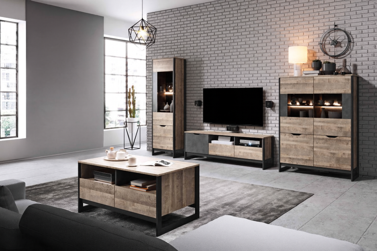 Originálny nábytok ARDEN v industriálnom štýle s nádychom svojskej jedinečnosti. Tento štýl vo výbere materiálov nekladie žiadne hranice, ponúka množstvo odtieňov hnedej, častokrát pôsobí ošúchaným dojmom. Mnohé nedostatky spája s funkčnosťou. Krásne ladí s tehličkovým obkladom stien, ktorý je inšpirovaný oblastiami priemyslu Ameriky. Samotný nábytok ARDEN je vyrobený z moderných materiálov v kombinácii farieb lepeného dubu s ľahko poškiabaným čiernošedým kovovým odtieňom. Konečný vzhľad je podčiarknutý čiernymi bočnými rámikmi z preglejky, ktoré precháchajú až do spodnej časti a vytvárajú podstavu.