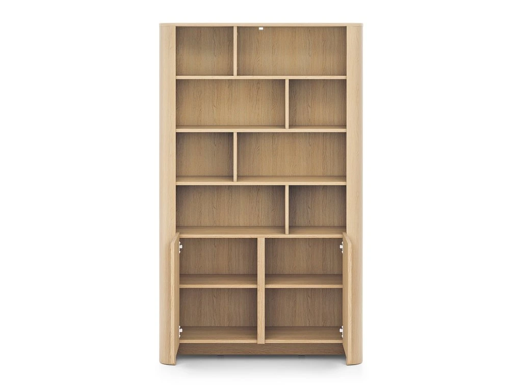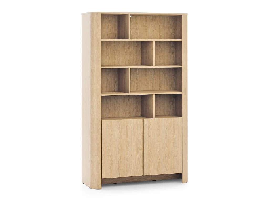 Moderný regál s množstvom otvorených priehradok a dolnou uzavretou časťou, ideálny na knihy, dekorácie alebo úložné boxy.
