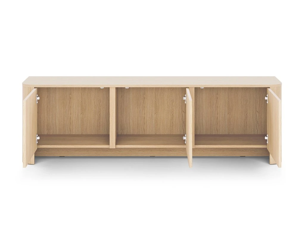 Elegantný stolík pod televízor s uzavretým úložným priestorom a praktickým riešením pre multimediálne zariadenia.
