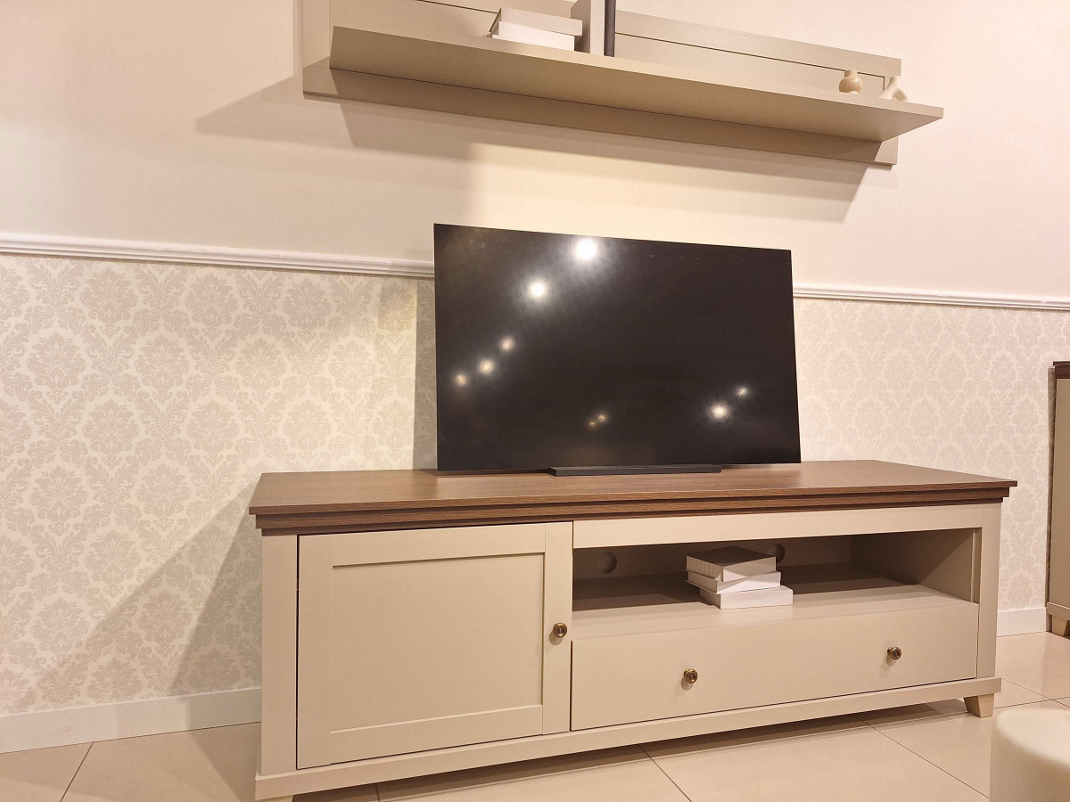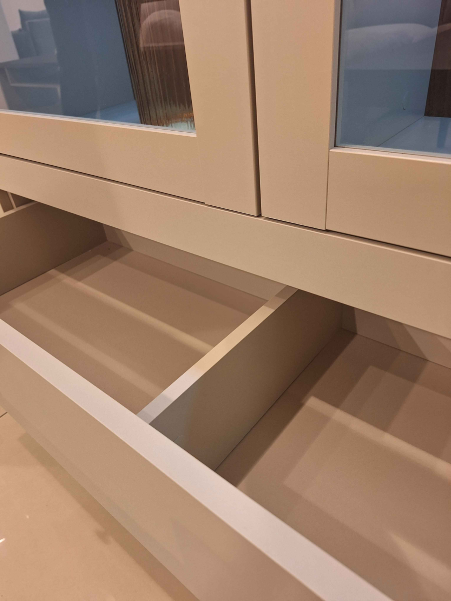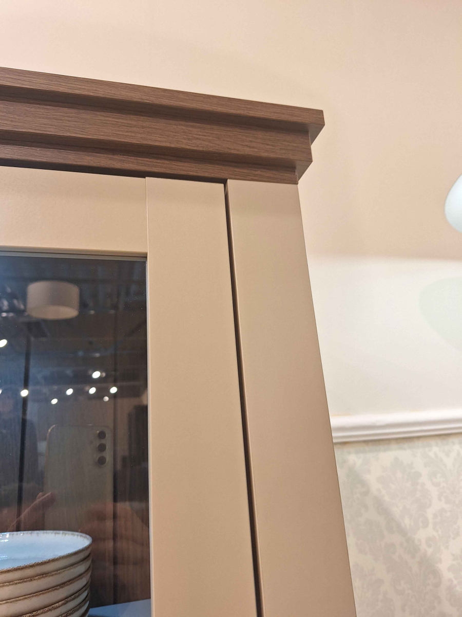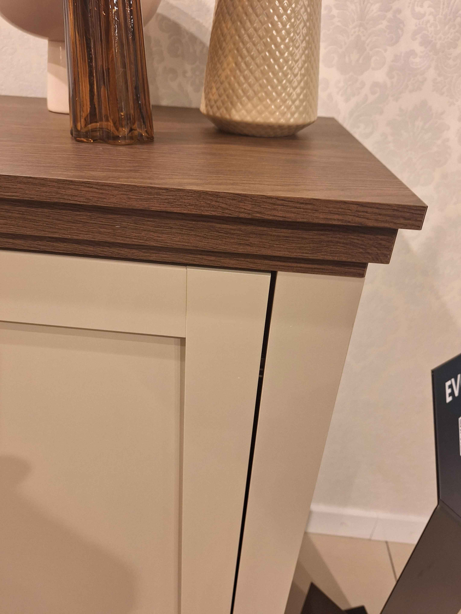 Krásna obývacia stena EVORA 24D1JU.. od firmy HM HELVETIA. Farebné prevedenie bežová - bežová / dub dunin je výsledkom najnovších trendov bytových dizajnérov. Čo sa týka štýlu je možné nábytok EVORA zaradiť do modernejšej verzie klasického dizajnu, je vhodný do obývacej izby alebo jedálne. Korpusy sú vyrobené z laminovanej DTD, dvierka a vrchné vence sú potiahnuté fóliou. Nožičky sú vyrobené z plastu. Použité kvalitné pánty a kovové úchytky, zatvárenie dvierok a šuflíkov je vybavené systémom pomalého zatvárania. Nábytok EVORA má výbornú kvalitu prevedenia, zabalený je demont v kartónoch. Možnosť doobjednať LED osvetlenie.