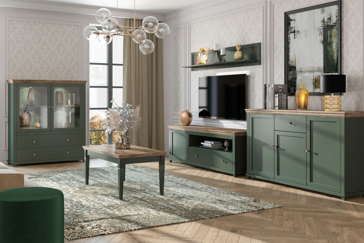 EVORA obývacia stena 24ZRJU.. od firmy HELVETIA. Netradičné farebné prevedenie tmavo zelená / dub lefkas je výsledkom najnovších trendov bytových dizajnérov. Čo sa týka štýlu je možné nábytok EVORA zaradiť do modernejšej verzie klasického dizajnu, je vhodný do obývacej izby alebo jedálne. Korpusy sú vyrobené z laminovanej DTD, dvierka a vrchné vence sú potiahnuté fóliou. Nožičky sú vyrobené z MDF a potiahnuté fóliou. Použité kvalitné pánty a kovové úchytky. Nábytok EVORA má výbornú kvalitu prevedenia, zabalený je demont v kartónoch. Možnosť doobjednať LED osvetlenie. Obývačka EVORA obsahuje: