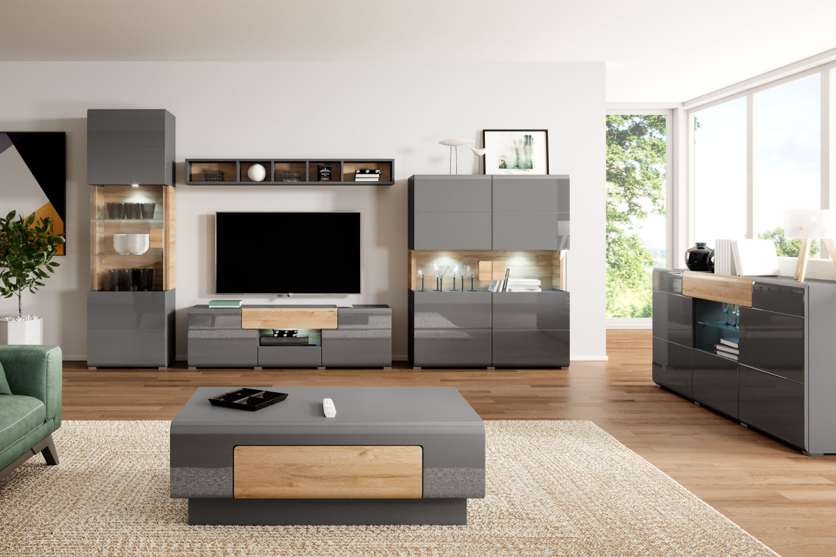 od renomovaného výrobcu IMS Helvetia predstavuje dokonalé spojenie moderného dizajnu, praktickosti a kvalitného spracovania. Táto elegantná obývacia zostava je ideálnou voľbou pre každého, kto hľadá štýlové a nadčasové riešenie pre moderný interiér. Dominantným prvkom nábytku je kombinácia luxusného vysokého lesku, ktorý dodáva priestoru teplo a útulnosť. Lesklé povrchy opticky zväčšujú miestnosť a pôsobia veľmi elegantne, zatiaľ čo drevený dekor vytvára príjemný kontrast. Sektorový systém TOLEDO umožňuje zostaviť obývačku presne podľa vašich predstáv. Jednotlivé skrinky, vitríny, TV stolík, komody či závesné police si môžete ľubovoľne kombinovať a prispôsobiť tak rozmerom aj štýlu vášho priestoru.