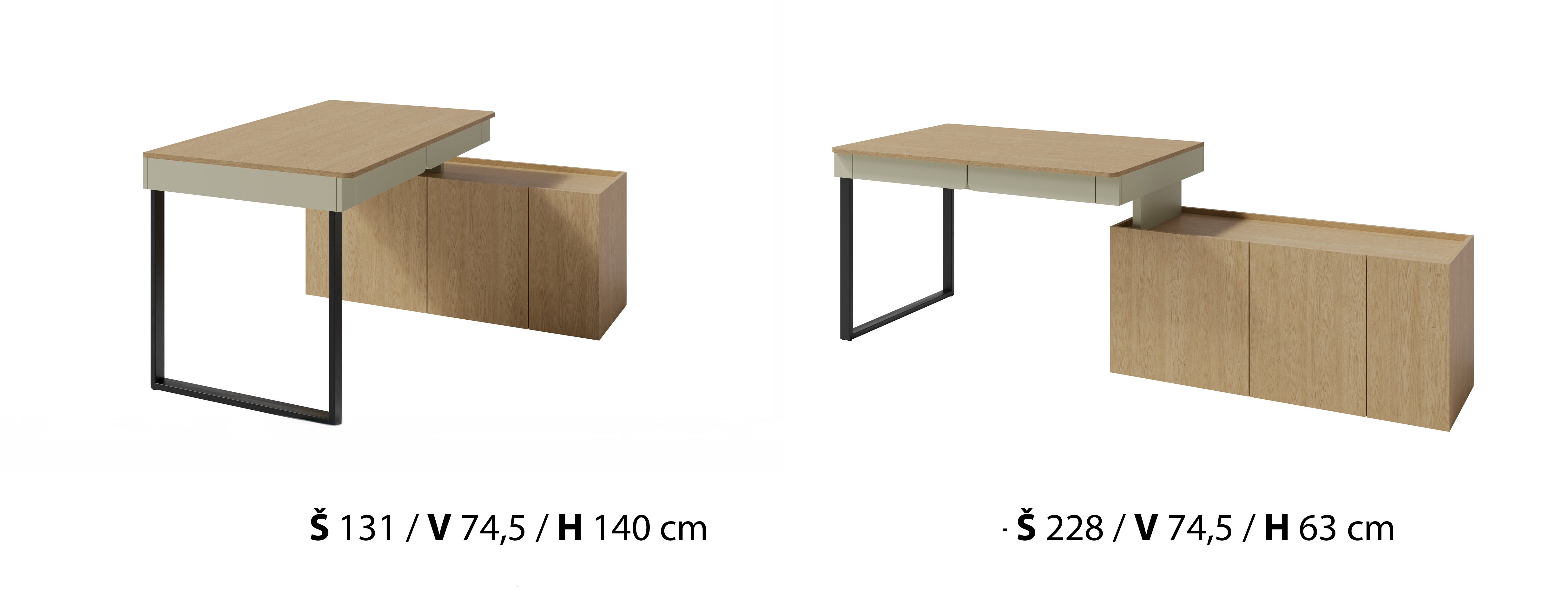 - Písacie stolíky sú dostupné v troch typoch na kovových nohách, v dvoch prípadoch doplnené o praktickú skrinku, vhodnú na umiestnenie do rohu alebo do roviny, pričom pod pracovnou doskou nájdete zásuvky pre ešte väčšie pohodlie.