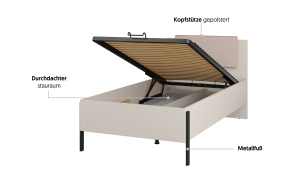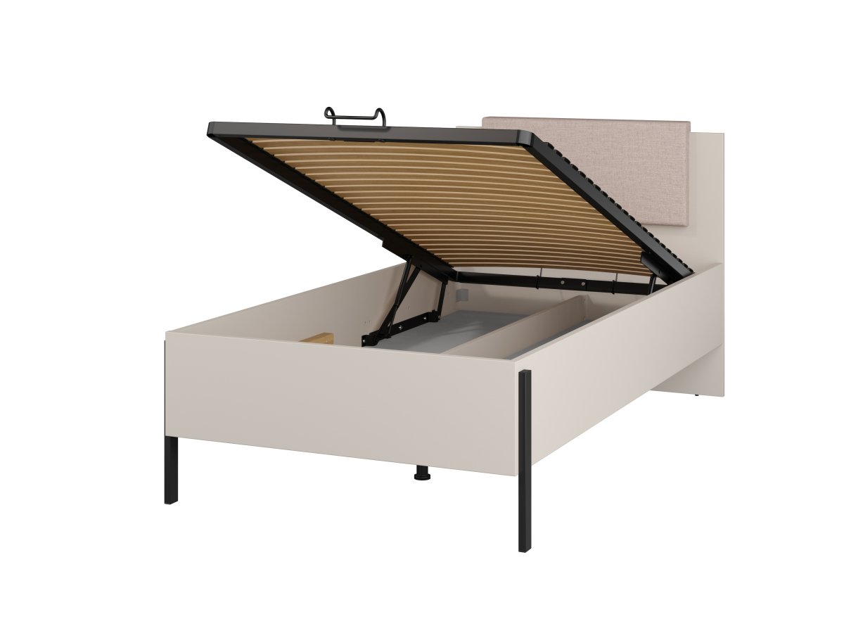 Sektorová spálňa JUKON - posteľ 24KSND54 - moderný spálňový nábytkový sektor v nadčasovom dizajne, trendovom farebnom prevedení kašmír, na vysokých / 19,5 cm / čiernych kovových nožičkách. Spálňa JUKON prinesie do interiéru vašej spálne eleganciu, atmosféru harmónie a tepla. Trendový kašmírový odtieň v kombinácii so štíhlymi čiernymi nohami vytvára jemný kontrast, ktorý prinesie do interiéru vašej spálne vizuálnu ľahkosť a vzdušnosť. Materál z ktorého je nábytok vyrobený je laminovaná certifikovaná drevotrieska v hrúbkach 15, 22 mm. Čelo je prečalúnené látkou MAYA 01. Cena postele je uvedená s lamelovým roštom na kovovom ráme s plynovými piestami a bez matraca.