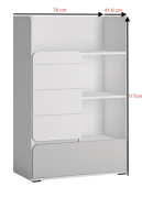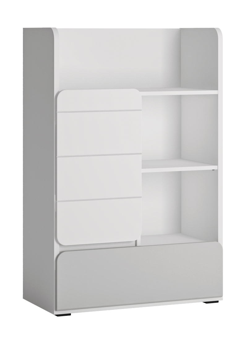 Kvalitný detský alebo študentský nábytok ALBI - regál 1D1S. Variabilný nábytkový sektor vo výbornom dizajne a kvalite prevedenia. Farebné prevedenie alpská biela - šedý lesk. Materiál korpusu je certifikovaná laminovaná drevotrieska v hrúbke 16 mm, dvere sú vyrobené z MDF na ktorej je vysokokvalitná fólia v lesku. Hrany sú na predĺženie životnosti ohranené ABS páskou, namiesto úchytiek sú na dvierkách výfrezy, nožičky sú plastové, vedenia v šuflíkoch sú s plným výsuvom.