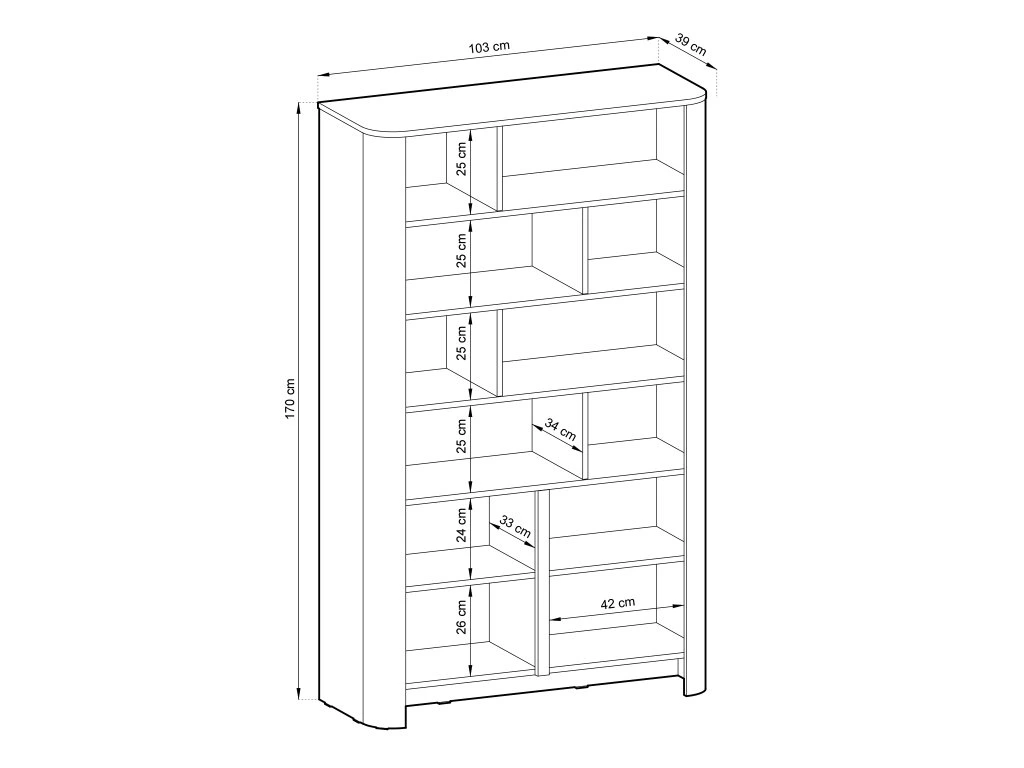 Policový regál BARI RG103 v dekore dub Vicenza ponúka elegantné riešenie s 12 otvorenými priehradkami a spodnou časťou s dvojicou dvierok. Otvorené priehradky sú ideálne na knihy, dekorácie či drobné doplnky, zatiaľ čo spodné uzavreté miesto poskytuje diskrétny úložný priestor.