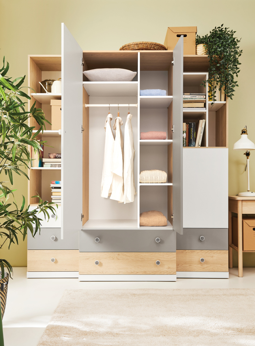 Súčasťou kolekcie sú rohové šatníky a skrine, ktoré poskytujú bohatý úložný priestor – či už v zásuvkách, policiach alebo na tyčiach na zavesenie oblečenia. Praktickosť dopĺňajú komody v rôznych šírkach a kombináciách úložného priestoru.