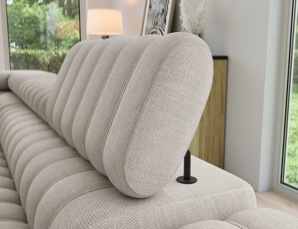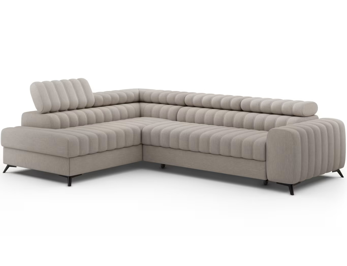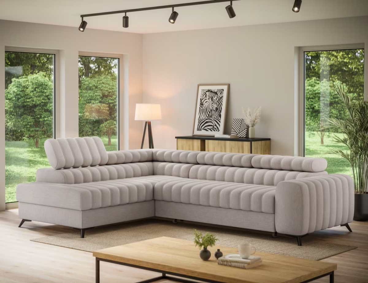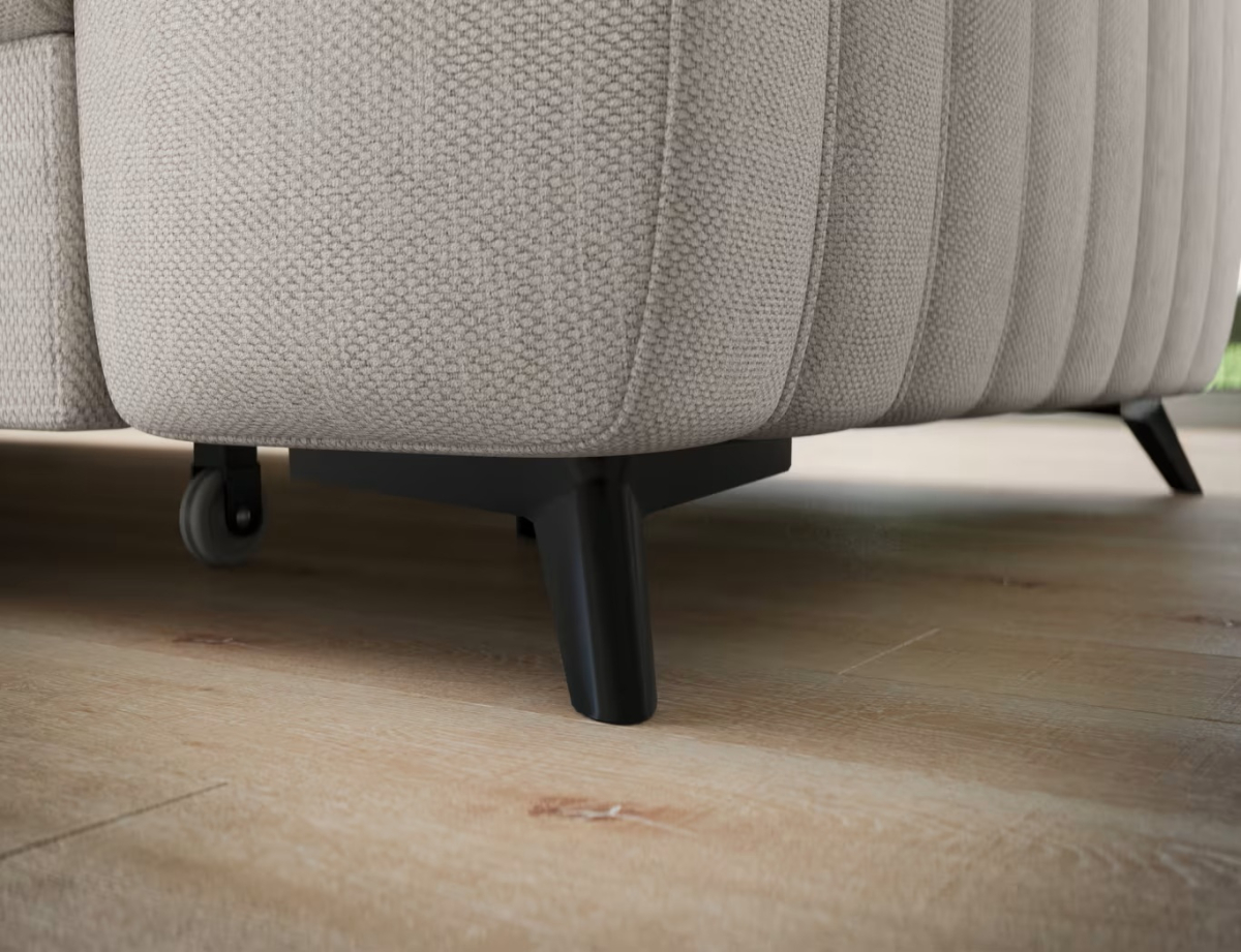 Rohová sedačka Kanedo je moderný dizajnový prvok, ktorý vyniká vertikálnym prešívaním sedacej aj operadlovej časti, čím vzniká výrazný a esteticky pôsobivý vzhľad. Je v ponuke vo viacerých kvalitných poťahových látkach s rôznou štruktúrou aj farebným prevedením, takže si ju môžete prispôsobiť podľa štýlu interiéru a osobných preferencií. Elegantný vzhľad dopĺňajú čierne kovové nožičky, ktoré opticky odľahčujú konštrukciu a zároveň zabezpečujú stabilitu a nadčasový štýl vhodný do moderných interiérov.