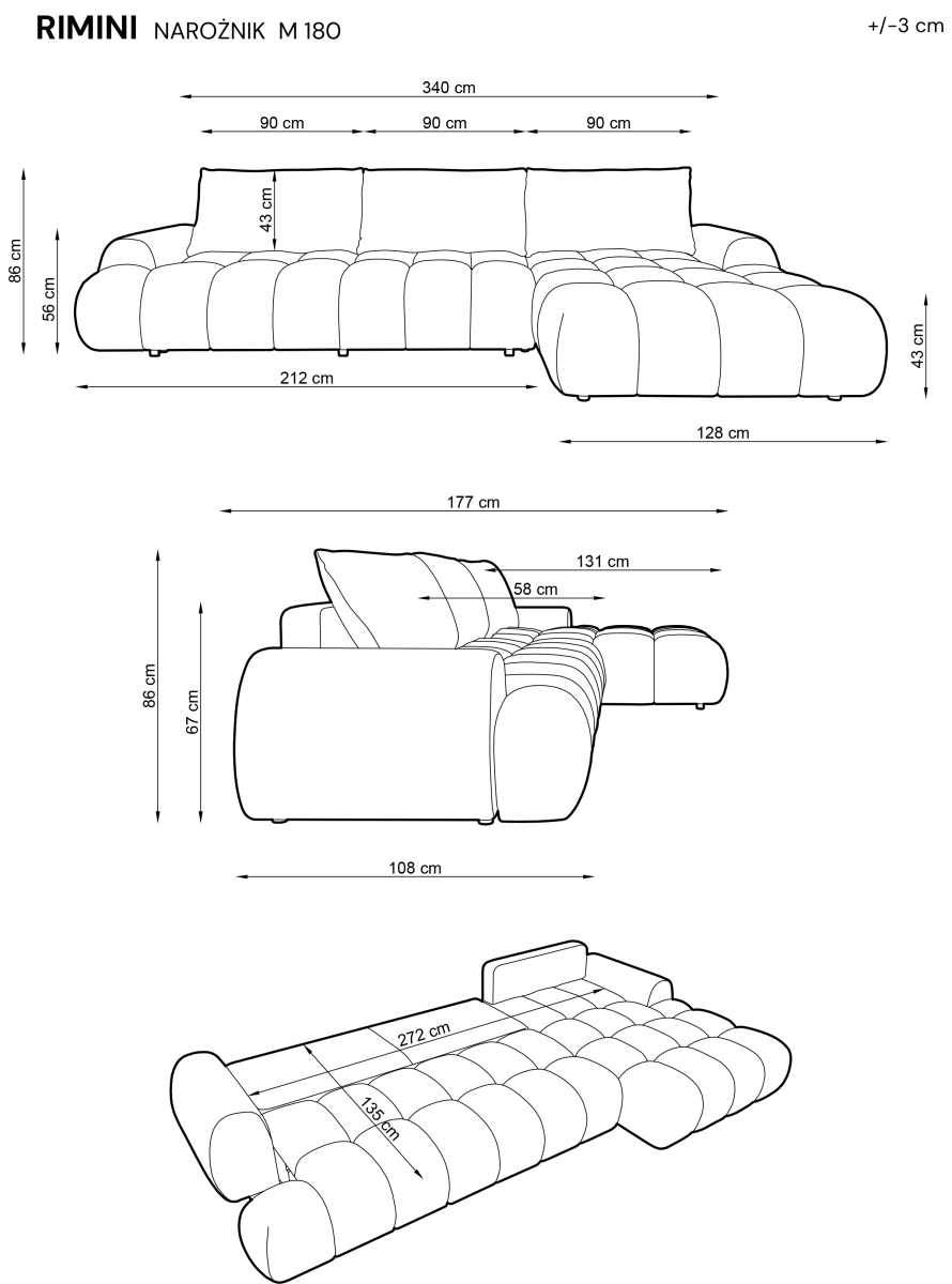 Moderná a nadčasová rohová sedacia súprava RIMINI spája dizajn, pohodlie a praktické funkcie v jednom elegantnom kúsku nábytku. Sedačka je s výrazným prešívaním do štvorcov pre atraktívny vzhľad a preto je ideálnou voľbou do moderných interiérov. Voľne ložené chrbtové vankúše umožňujú individuálne prispôsobenie – každý si ich môže upraviť podľa potreby, prípadne úplne odložiť pri rozklade alebo čistení. Rozkladací mechanizmus je intuitívny a nenáročný na obsluhu. Sedaciu časť stačí vysunúť smerom k sebe a následne chrbtovú opierku jednoducho preklopiť nadol. Týmto pohybom vznikne rovná a priestranná plocha na spanie, vhodná pre návštevy. Pod vysúvacou časťou sa nachádza praktický úložný priestor, do ktorého môžete jednoducho uložiť posteľnú bielizeň, deky, vankúše alebo sezónne veci. Úložný priestor je dobre prístupný a nezasahuje do vizuálu pohovky.