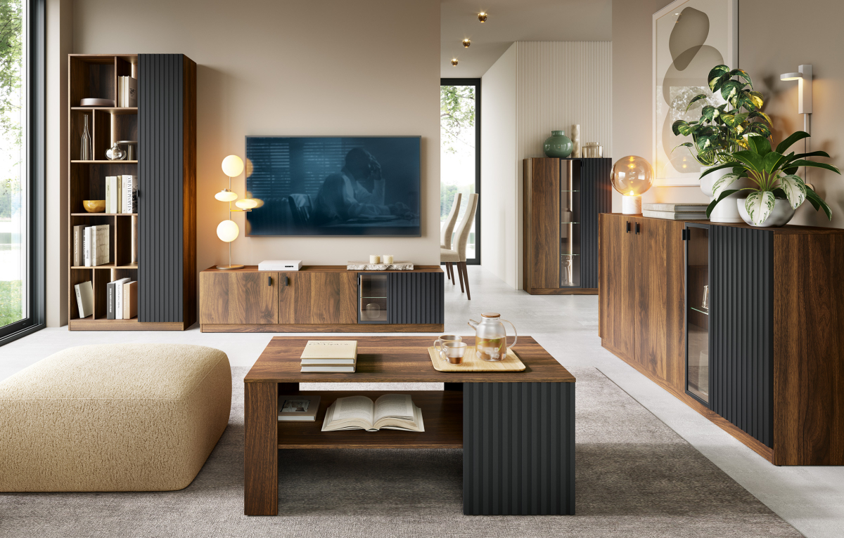 Sektorový nábytok RADIUM - konferenčný stolík č.41,  predstavuje dokonalé spojenie moderného dizajnu, kvalitných materiálov a praktických riešení pre každodenné používanie. Elegantná kombinácia dekoru orech columbia a matnej čiernej farby vytvára nadčasový vzhľad, ktorý dokonale zapadne do moderných aj minimalistických interiérov. Vďaka modulárnemu riešeniu si môžete zostavu prispôsobiť presne podľa svojich potrieb a priestoru. RADIUM ponúka dostatok úložného priestoru pre elektroniku, knihy, dekorácie aj každodenné drobnosti. Obývačkový sektor RADIUM orech columbia – čierna je prémiový sektorový nábytok do obývačky, ktorý spája štýl, funkčnosť a komfort. Vďaka LED osvetleniu, tichému zatváraniu a precíznemu spracovaniu sa stane dominantou vášho interiéru. Integrované LED osvetlenie zarátané v cene, dodáva nábytku luxusný vzhľad a zároveň vytvára príjemnú svetelnú atmosféru v obývačke. Osvetlené vitríny a police zvýraznia dekorácie, knihy či dizajnové doplnky.