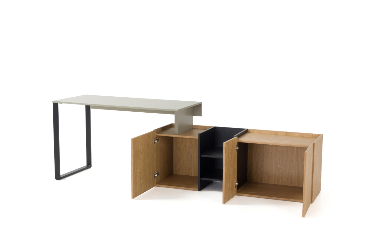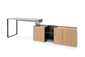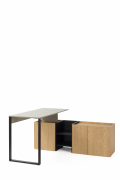 Asymetrické detaily - skrine a komody zaujmú netradičným členením dvierok a otvorenými policami v dekore duba, ktoré slúžia na vystavenie kníh či dekorácií.