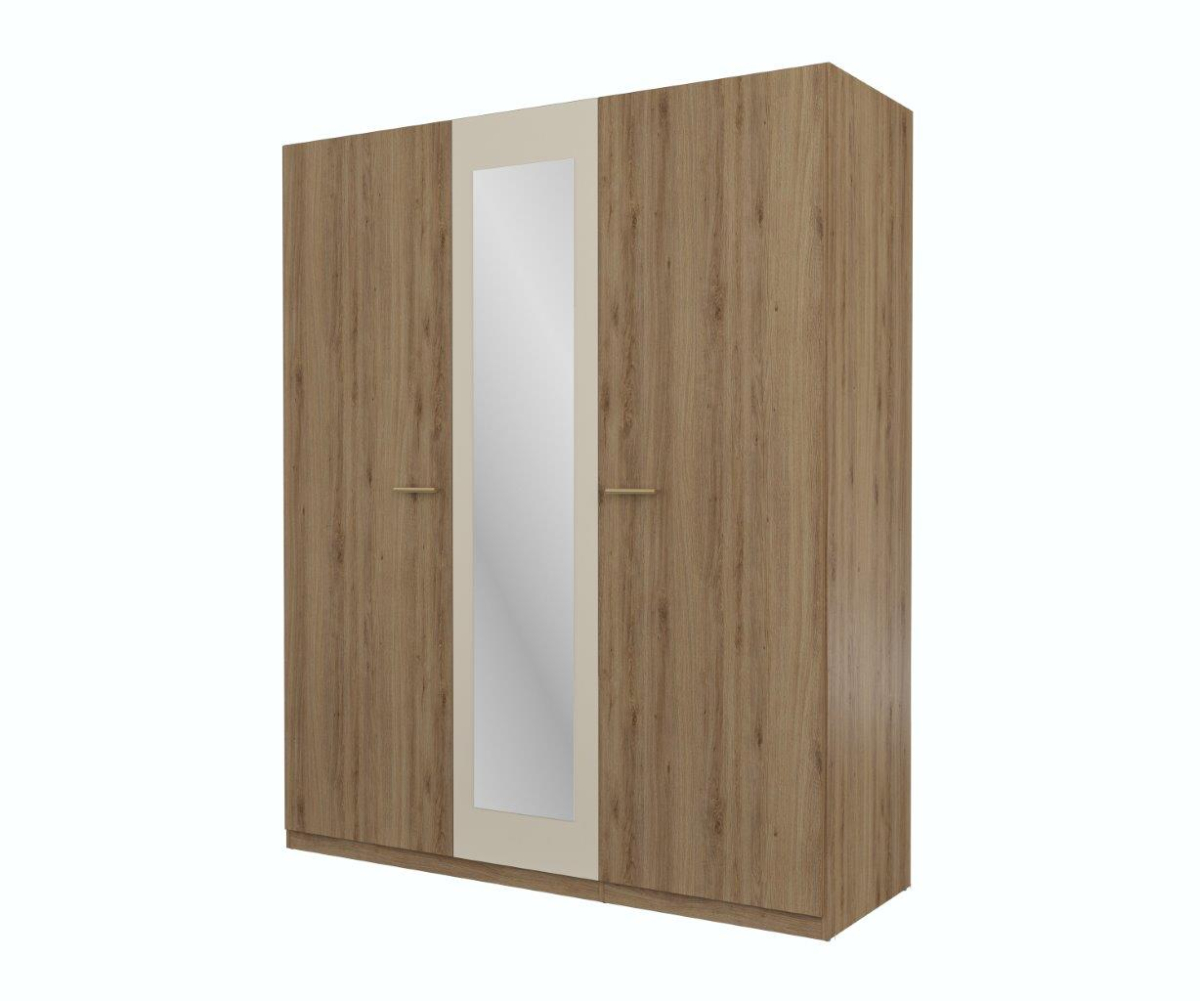 Sektorový nábytok do spálne VERTINA - skriňa trojdverová 24DBNH19, od firmy IMS HELVETIA. Moderná sektorová spálňa vo výbornej kvalite prevedení a vo farebnom prevedení divoký dub - béžová - 24DBNH.. Spálňa VERTINA spĺňa aj tie najnáročnejšie požiadavky zákazníkov. Vyrobená je z certifikovanej laminovanej DTD vysokej kvality odolnej voči poškriabaniu, ÚV žiareniu a vlhkosti. Skriňa v dvoch veľkostiach / 3-dverovámá, 4-dverová / má klasicky otvárané dvere v kombinácii so zrkadlom - možnosť dokúpiť okrasné lišty okolo korpusu skrine. Posteľ je vyrobená z laminovanej DTD vysokej kvality, čelo postele je hladké. Posteľ sa vyrába v dvoch veľkostiach šxvxh 160,180x200 cm. Do postele je možné dokúpiť klasické drevenné rámové rošty, alebo kovový rámový rošt so zdvíhaním na plynových piestoch. Nočný stolík má dva výsuvné šuflíky. Komoda obsahuje štyri výsuvné šuflíky. Úchytky sú zlaté plastové.