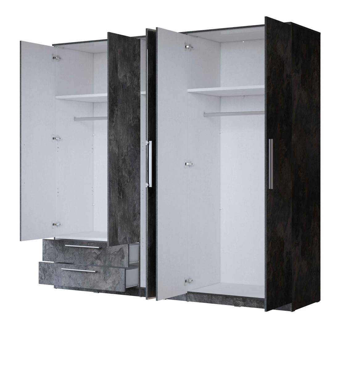 Sektorová spálňa INDIA skriňa 5-dverová 24BODE21 - moderný sektorový nábytok do spálne v netradičnom farebnom prevedení schiefer 24B0DE.. Materiál, z ktorého je spálňa vyrobená korusy - certifikovaná laminovaná drevotrieska, dvierka - certifikovaná laminovaná drevotrieska. V skrini, komode, nočnom stolíku je zabudované RGB LED osvetlenie / meniace farbu nastavením na ovládači /, LED osvetlenie je zarátané v cene. Úchytky sú plastové v striebornej farbe, možnosť za príplatok dokúpiť police do skríň v dvoch veľkostiach.