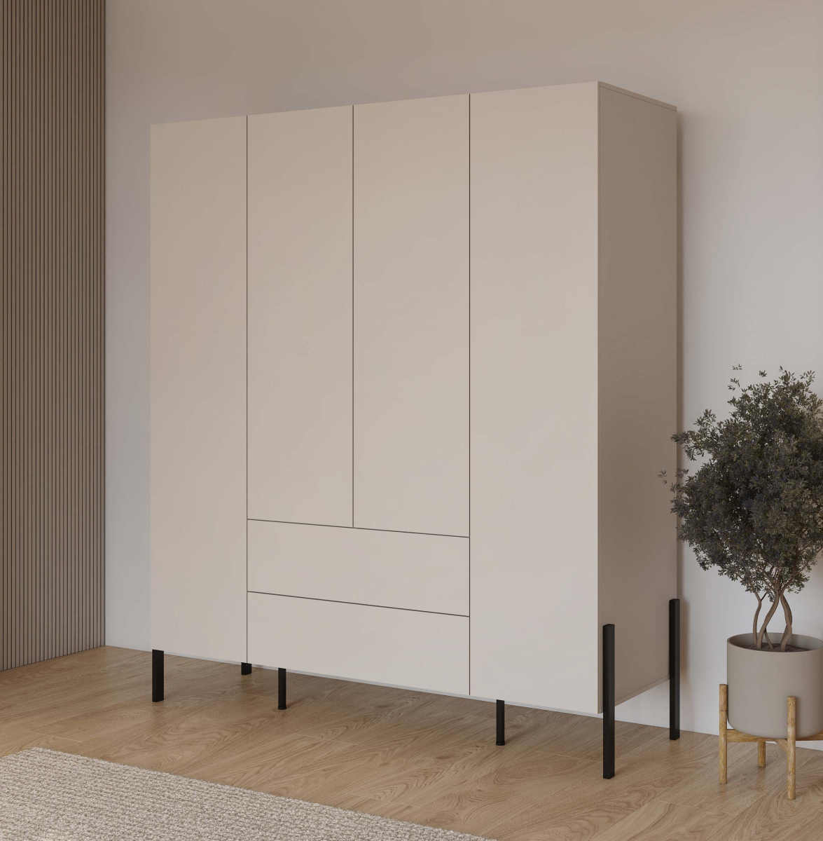 Sektorová spálňa JUKON - skriňa 24KSND20 - moderný spálňový nábytkový sektor v nadčasovom dizajne, trendovom farebnom prevedení kašmír, na vysokých / 19,5 cm / čiernych kovových nožičkách. Spálňa JUKON prinesie do interiéru vašej spálne eleganciu, atmosféru harmónie a tepla. Trendový kašmírový odtieň v kombinácii so štíhlymi čiernymi nohami vytvára jemný kontrast, ktorý prinesie do interiéru vašej spálne vizuálnu ľahkosť a vzdušnosť. Materál z ktorého je nábytok vyrobený je laminovaná certifikovaná drevotrieska v hrúbkach 15, 22 mm. Úchytky nie sú, na otváranie slúži systém STLAČ A OTVOR.