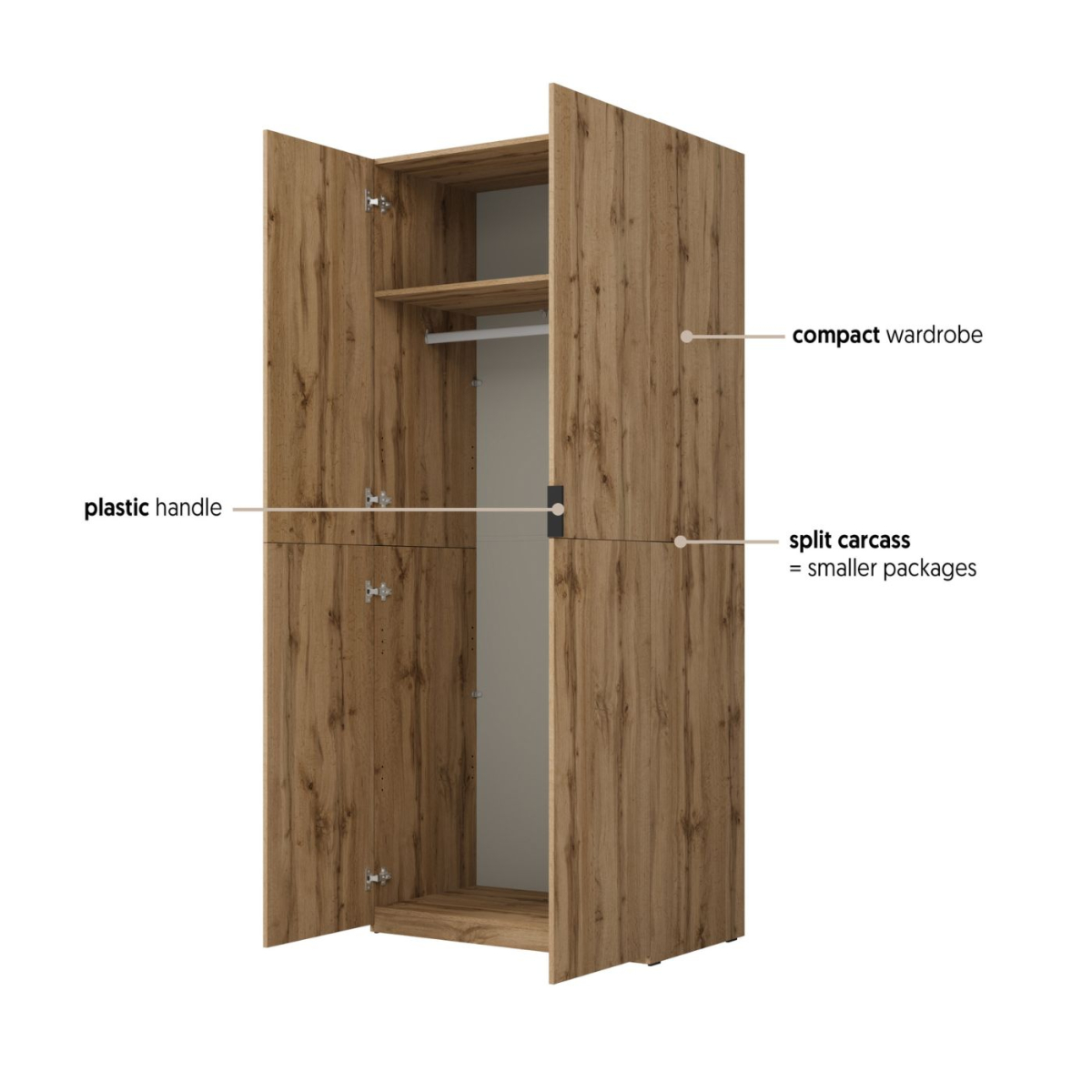V hornej časti skrine sa nachádza polica, pod ňou je vešiaková tyč ideálna na košele, kabáty alebo šaty. Do spodnej časti je možné dokúpiť ďalšiu policu 87x48x2 cm (odtieň v dekore linen) a zväčšiť tak úložný priestor podľa potreby. Skriňa je vybavená praktickými plastovými úchytkami, ktoré uľahčujú otváranie dverí.