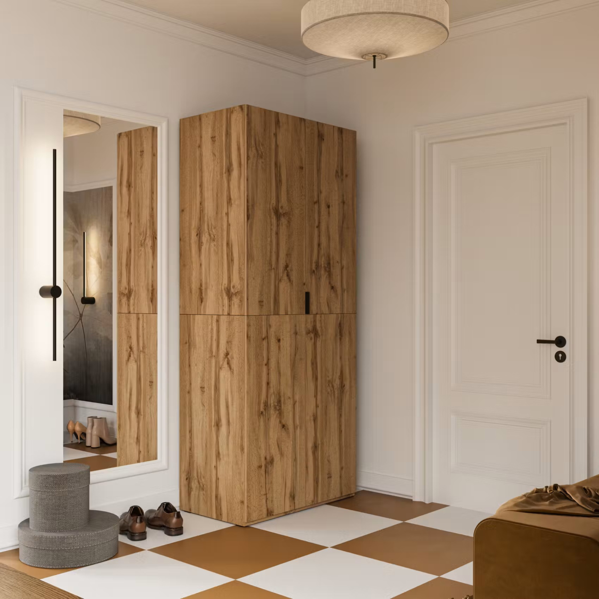 Bočnice ani dvere nie sú v kuse po celej výške – sú delené na dve časti, čo umožňuje jednoduchú manipuláciu a montáž aj v nedostupných priestoroch, napríklad pri prenáške cez úzke chodby alebo schodisko. Takto si skriňu ľahko zmontujete aj doma.