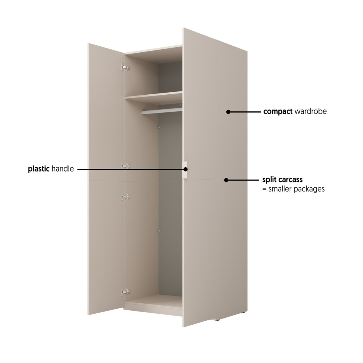 Bočnice ani dvere nie sú v kuse po celej výške – sú delené na dve časti, čo umožňuje jednoduchú manipuláciu a montáž aj v nedostupných priestoroch, napríklad pri prenáške cez úzke chodby alebo schodisko. Takto si skriňu ľahko zmontujete aj doma.