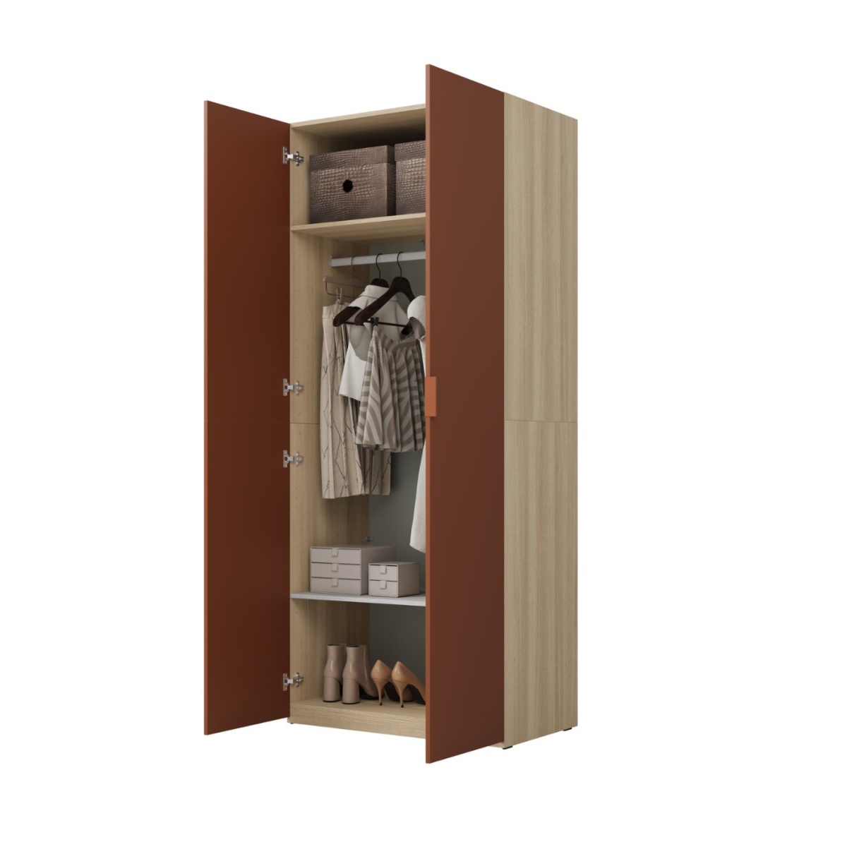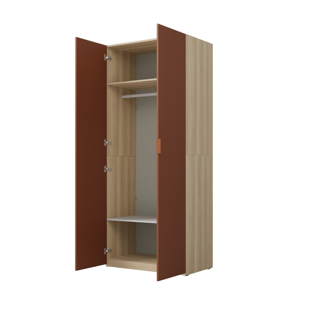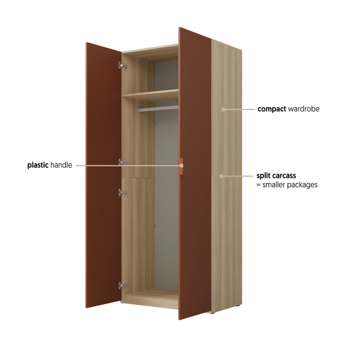 Šatníková skriňa MONTANA 24ETOL18 v kombinácii odtieňov terakota a dub Elegant prináša praktické a štýlové riešenie úložného priestoru pre spálne, detské izby alebo predsiene. Táto dvojdverová skriňa s klasickým otváraním na pántoch je dostupná v troch moderných farebných variantoch, takže si ju ľahko vyberiete podľa vášho interiéru.