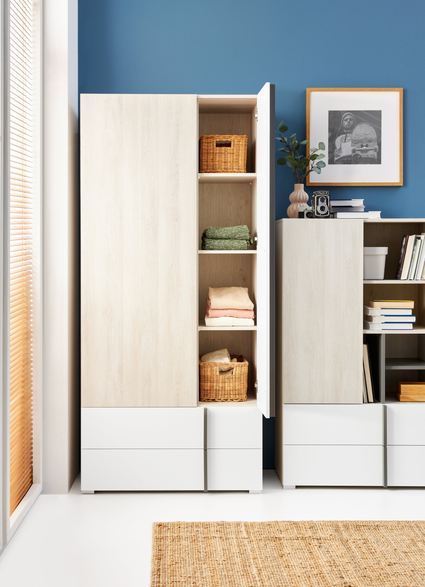 Systém zahŕňa skrine s kombinovaným úložným priestorom na vešanie aj ukladanie do políc, praktické zásuvky, regále, písacie stolíky, nástenné poličky a posteľ v šírke 90 alebo 120 cm. Jednotlivé moduly možno ľubovoľne kombinovať a vytvoriť tak zostavu presne podľa dispozície miestnosti a individuálnych potrieb.