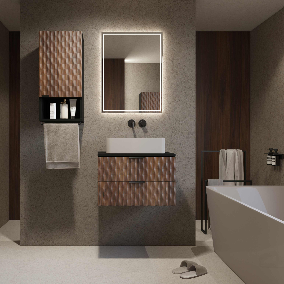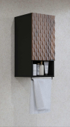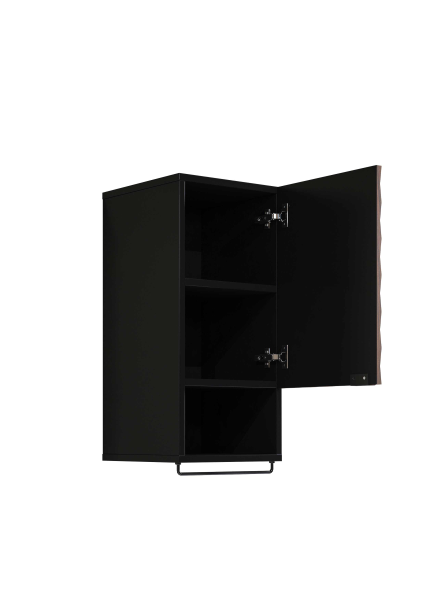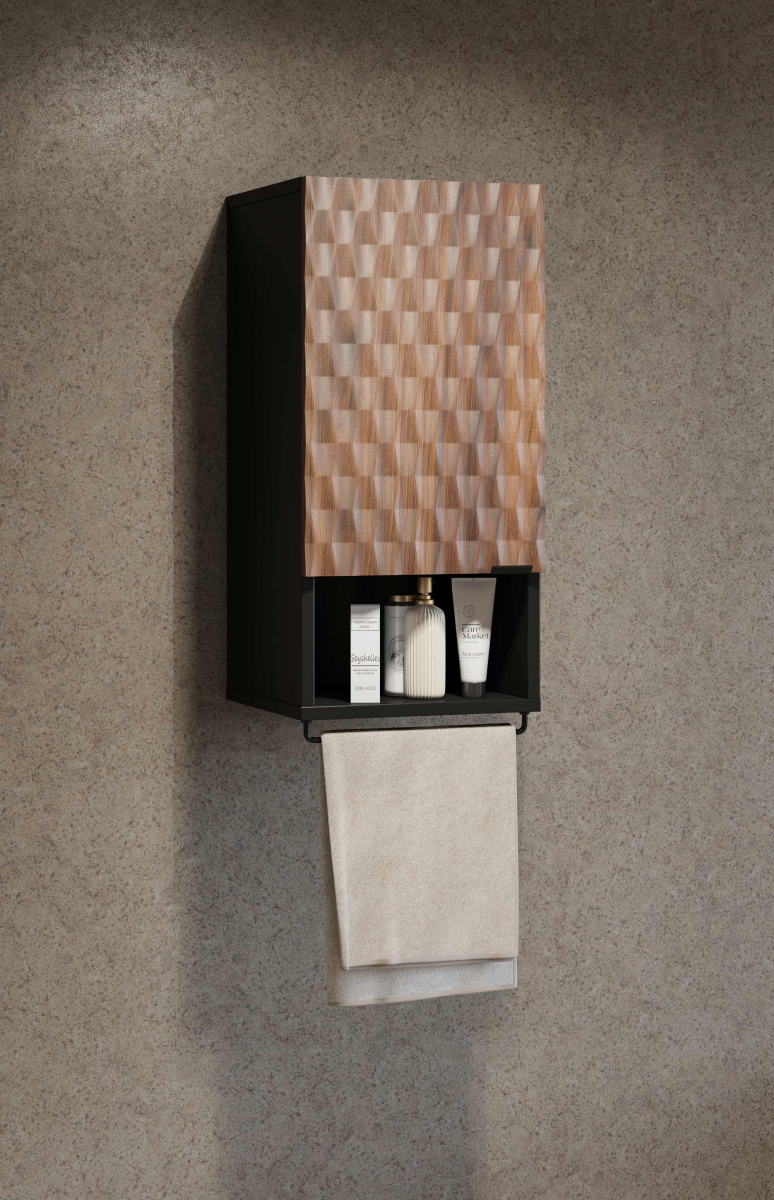 Moderný kúpeľný nábytok ENZO - skrinka na zavesenie 30WTNN03 Ľ,P. Kvalitný sektorový nábytok do kúpeľne s 3D vzorom na dvierkach. Korpusy o hrúbke 18 mm, sú vyrobené z laminovanej certifikovanej drevotriesky napustenej špeciálnym lepom odolným voči vlhkosti vo farebnom prevedení čierny onyx. Ohranené sú ABS páskou na predĺženie životnosti. Dvierka sú vyrobené z MDF na povrchu s 3D efektom vo farebnom prevedení dub catania. Použité kvalitné pánty HETTICH s pomalým zatváraním, úchtky sú kovové čierne.
