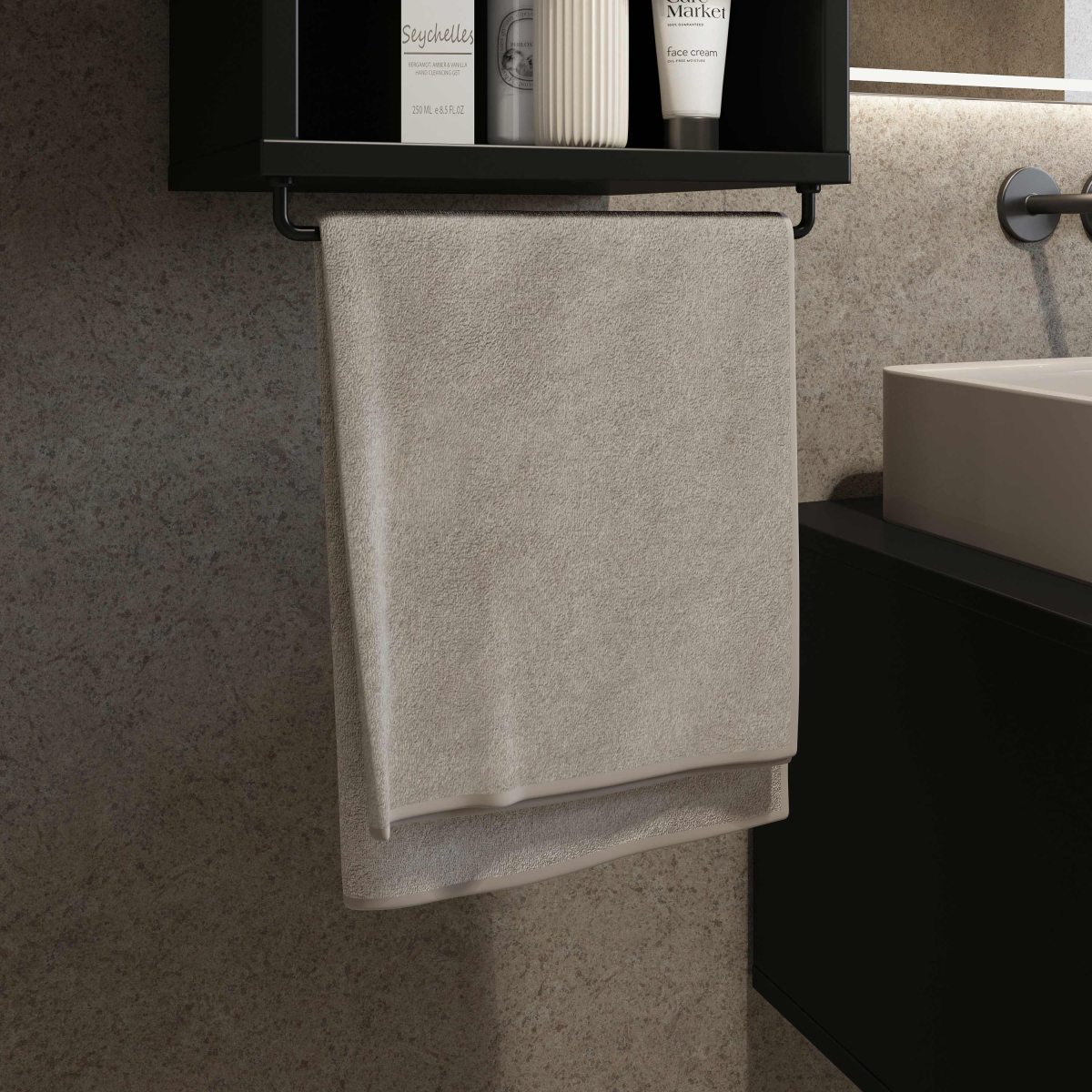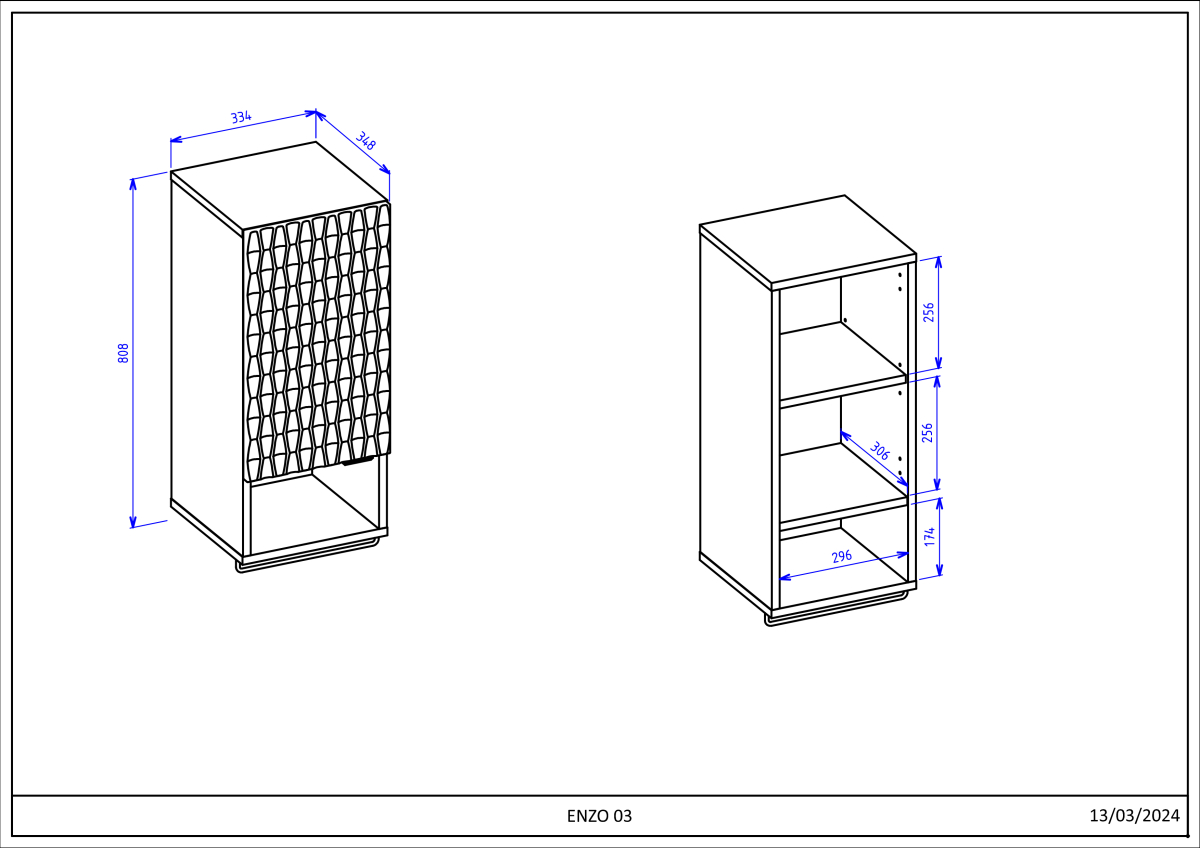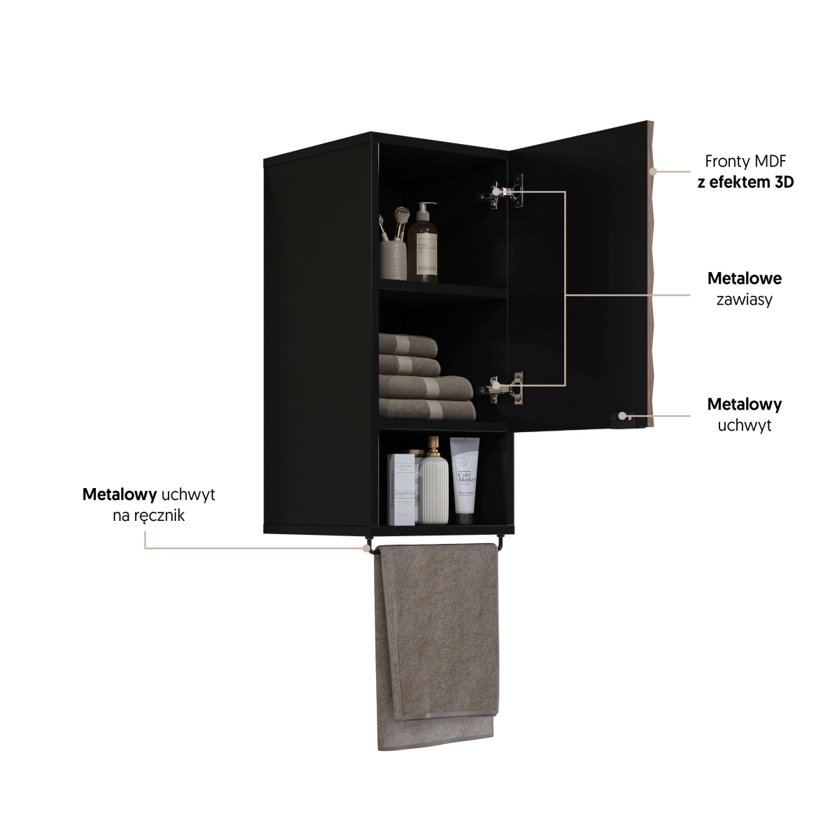 Moderný kúpeľný nábytok ENZO - skrinka na zavesenie 30WTNN03 Ľ,P. Kvalitný sektorový nábytok do kúpeľne s 3D vzorom na dvierkach. Korpusy o hrúbke 18 mm, sú vyrobené z laminovanej certifikovanej drevotriesky napustenej špeciálnym lepom odolným voči vlhkosti vo farebnom prevedení čierny onyx. Ohranené sú ABS páskou na predĺženie životnosti. Dvierka sú vyrobené z MDF na povrchu s 3D efektom vo farebnom prevedení dub catania. Použité kvalitné pánty HETTICH s pomalým zatváraním, úchtky sú kovové čierne.