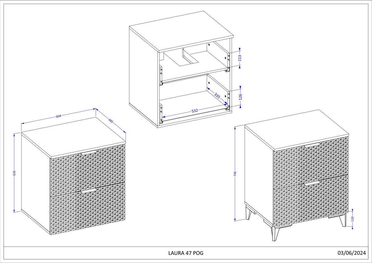 Kúpeľňový nábytok LAURA biela - skinka pod umývadlo LAURA biela 3097NM47, moderný sektorový nábytok do kúpeľne vyrobený vo výbornej kvalite prevedenia, farebné prevedenie biela matná/biela matná pyramídky. Materiál použitý na výrobu korpus - certifikovaná laminovaná drevotrieska v hrúbke 15 mm, hrany ohranené ABS páskou, dvierka - fólia na MDF v hrúbke 18 mm - profil dvierok v tvare malých pyramíd. Úchytka je kovová v zlatej farbe, zatváranie dvierok a šuflíkov pomocou systému pomalého zatvárania.
